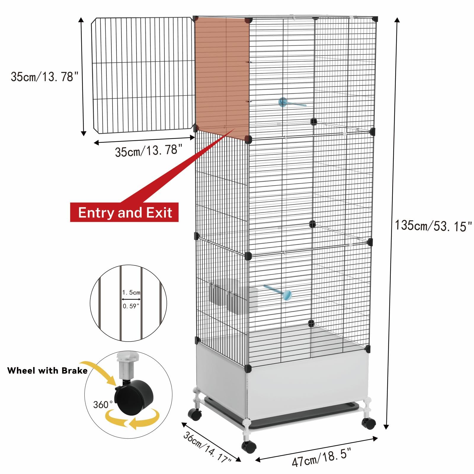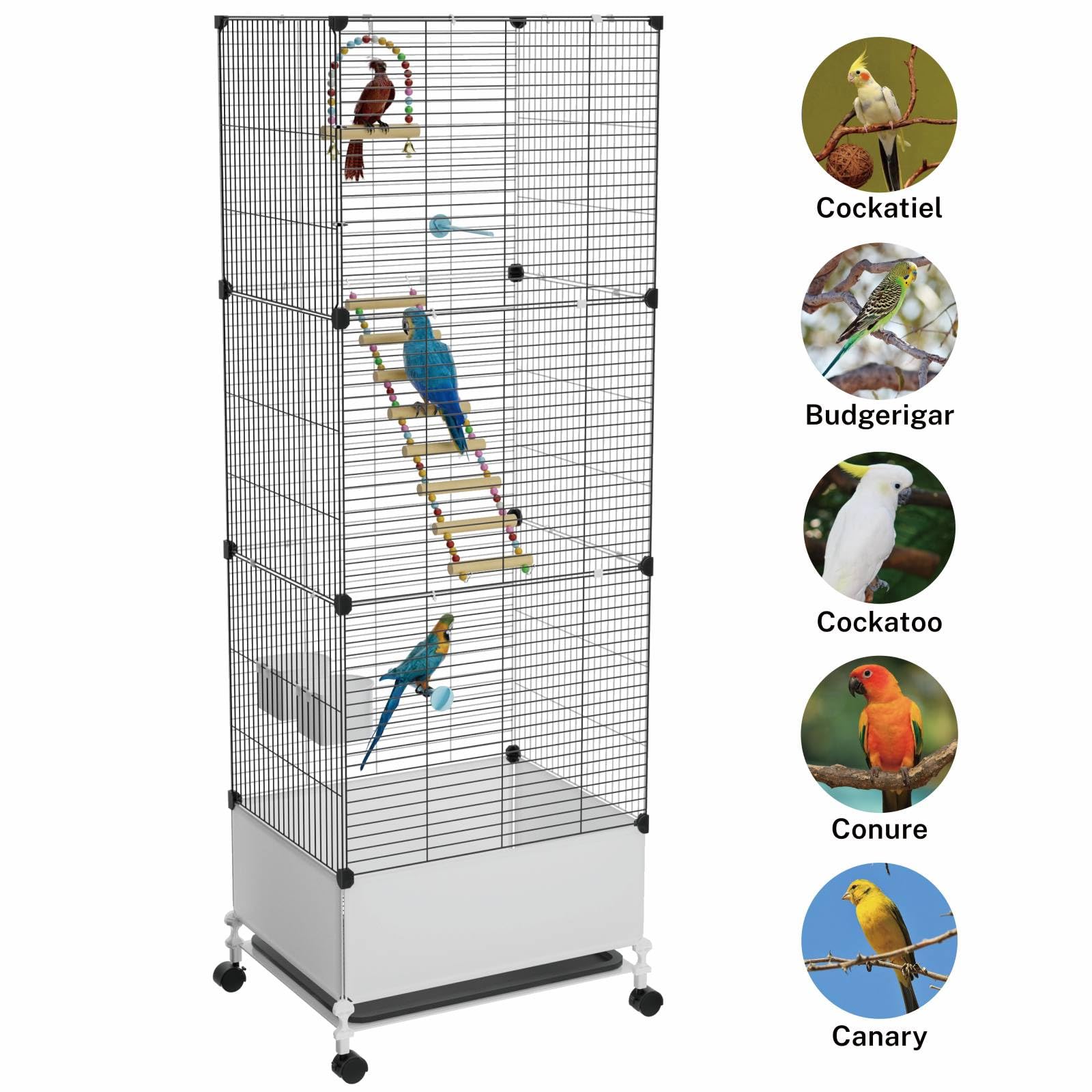 [Extra Large Bird Cage]: Our pet cage measures 14.17" × 18.5" × 53.15", enlarged to offer larger space; this cage is suitable for large, medium and small birds such as parakeets, parrots, conures, cockatiels, canaries, etc. The 0.59" bar spacing offers safety, making it a perfect home for your feathered friend.