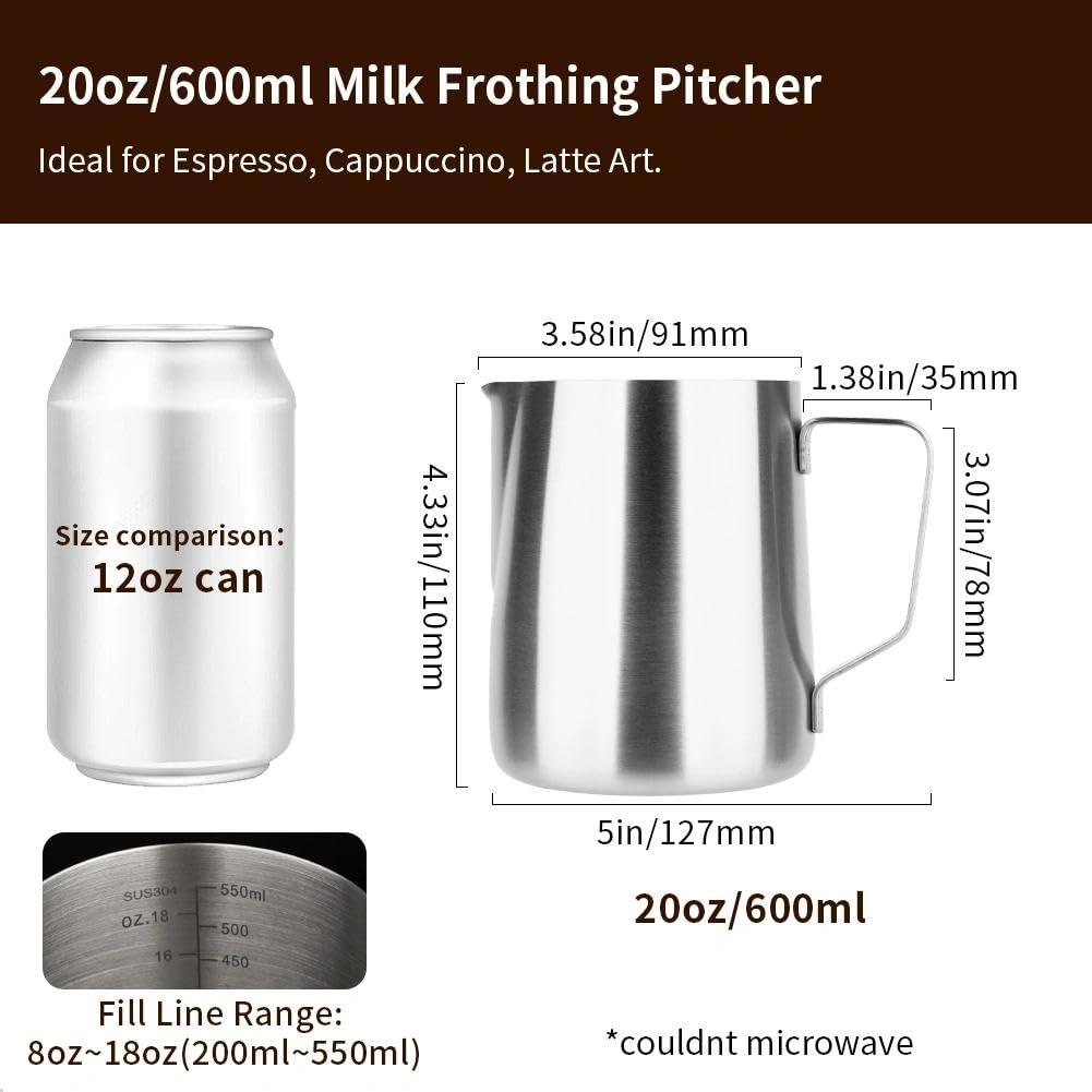 Perfect for Latte Art: Ensure precise and controlled pouring without drips. This pitcher is ideal for frothing or steaming milk for espresso, cappuccino, or hot chocolate, helping you easily create perfect latte art. Suitable for both professional baristas and coffee lovers. Premium Material: Crafted from food-grade 304 stainless steel, watchget milk frothing pitcher is durable, wear-resistant, and heat resistant. The well polished inside prevents rust and ensures long-term use. Easy to clean and use, offering excellent temperature control. Ergonomic Handle: Features an ergonomic handle for a comfortable grip and precise control over pouring speed and direction, beginner friendly. Clear Scale Lines: The clear internal measurement lines (ml/oz) make it easy to control the amount of milk or cream per cup of coffee. Available in 12oz/20oz/32oz sizes to meet your different needs. Ideal for foaming or steaming milk for espresso and cappuccinos, and versatile for measuring other liquids like water, juices, batter mixes, smoothies, etc. Dripless Spout Design: The dripless spout design ensures smooth and precise pouring without drips. Practice and easily create your own beautiful latte art. Please note: The maximum capacity of this pitcher is 12oz/350ml with a scale range of 4oz-11oz (120-330ml).We recommend that the first use add no more than half the capacity of the container for the milk frothing to prevent spraying.