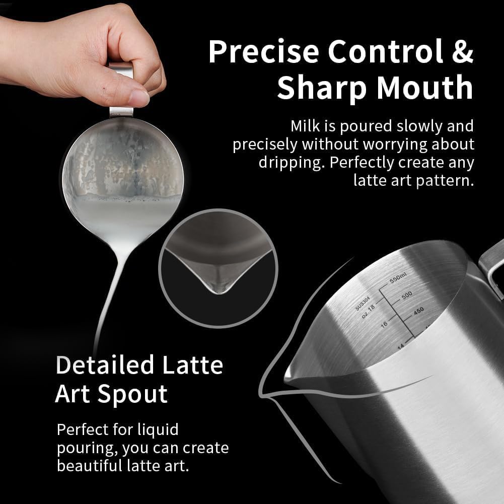 Dripless Spout Design: The dripless spout design ensures smooth and precise pouring without drips. Practice and easily create your own beautiful latte art.