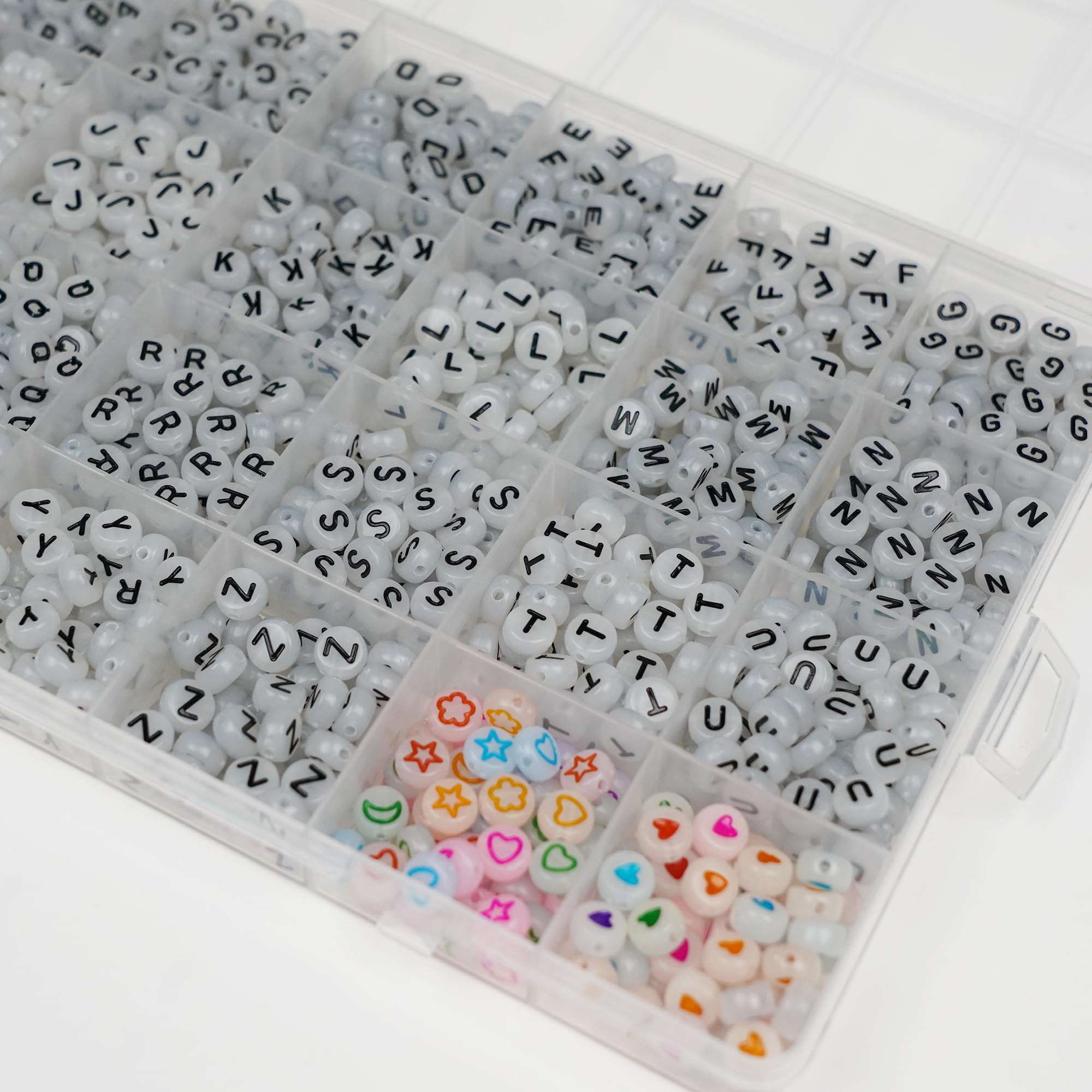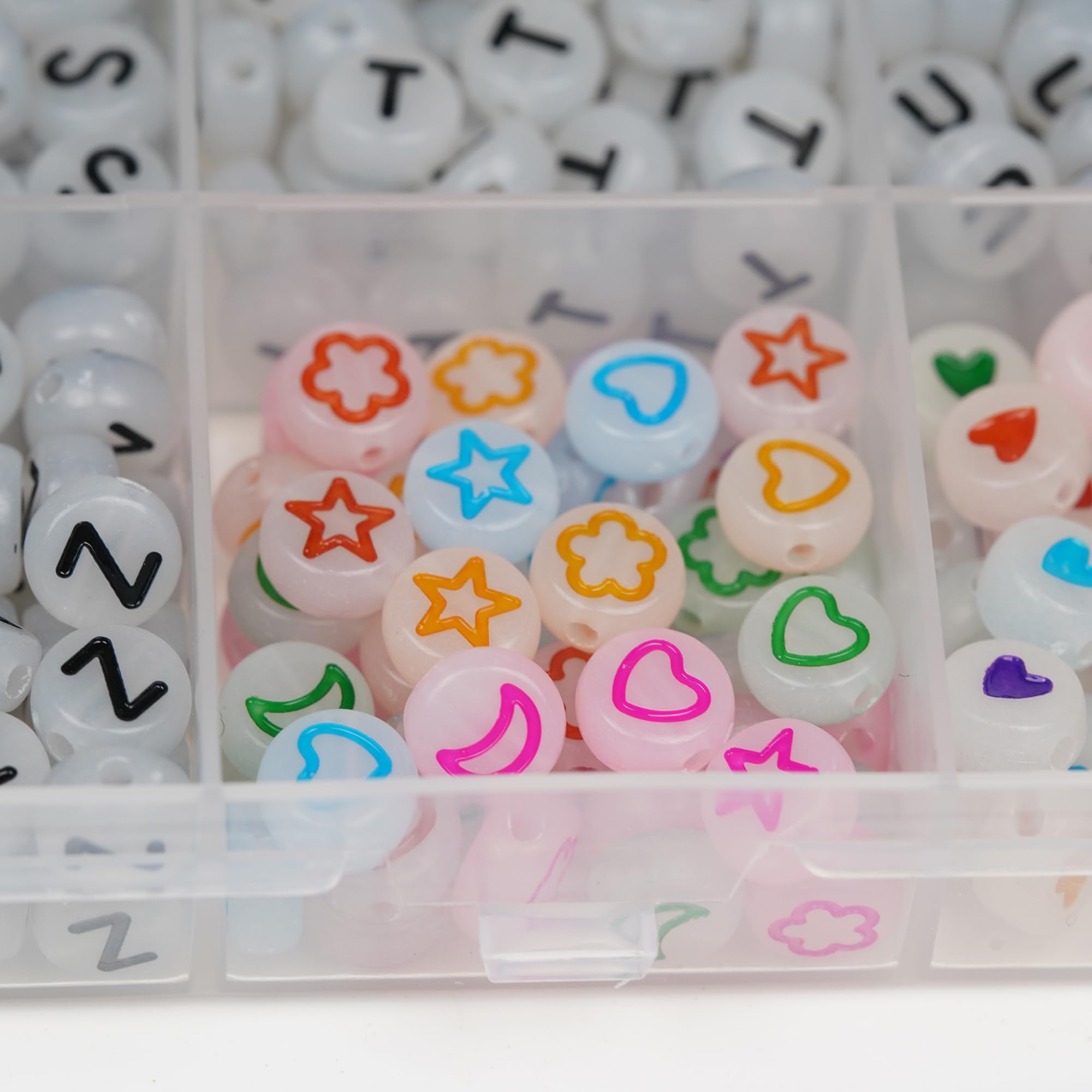 You will get: a 28-grid box with 26 letters, pattern beads (stars, hearts, moons), 50 pieces for each type of beads, and extra 10 beads for each vowel. the set has a total of 1450 pcs 4*7 round acrylic glow beads.