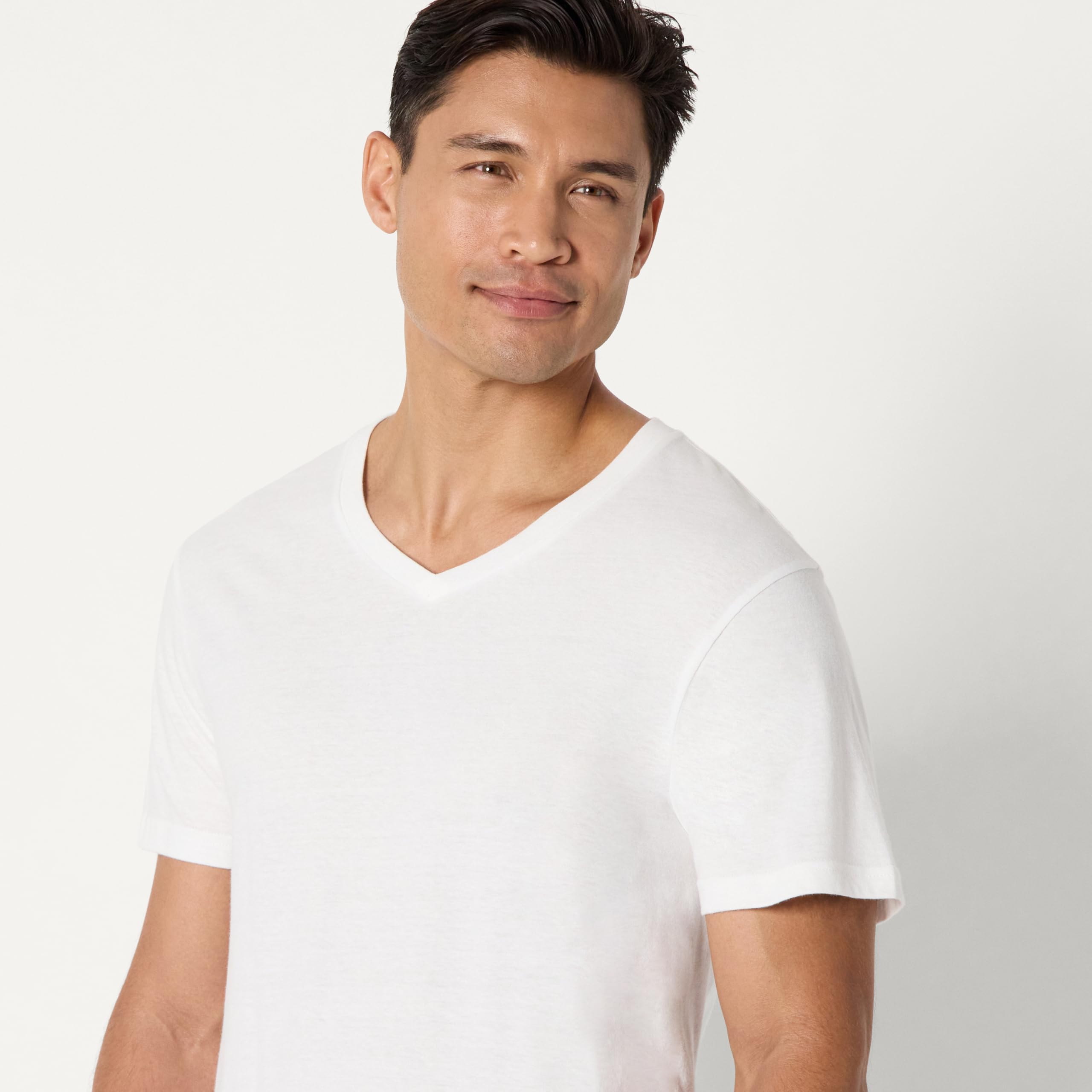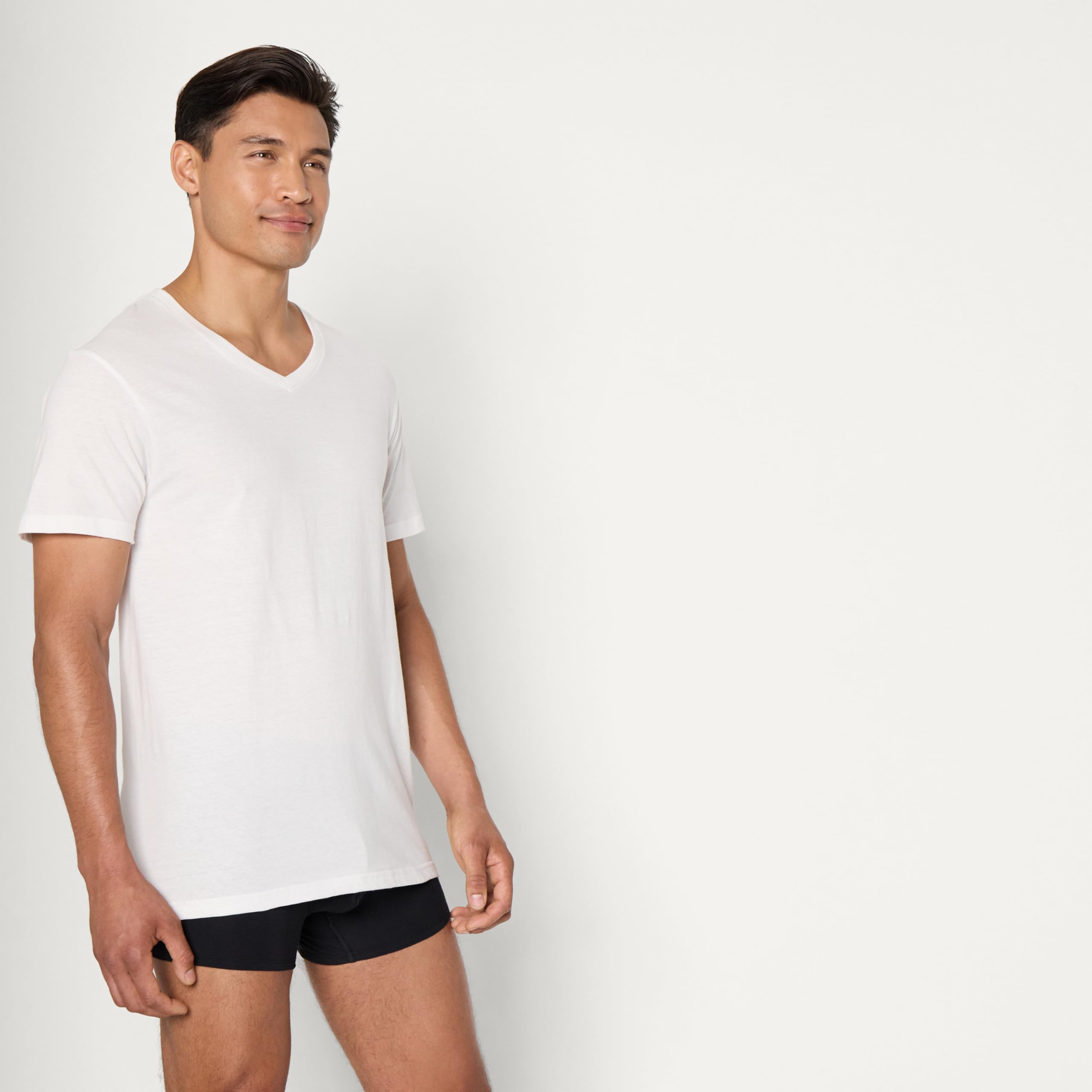 DETAILS: Designed with short-sleeves and a straight hem which are finished with super soft flexible stitching. The v-neck is banded for extra durability and has a printed label at the back neck