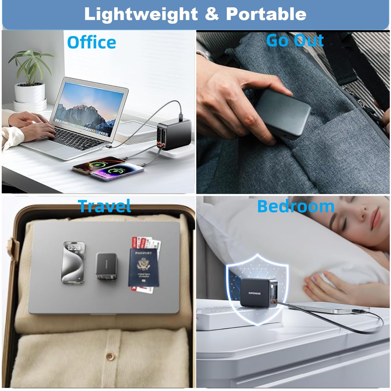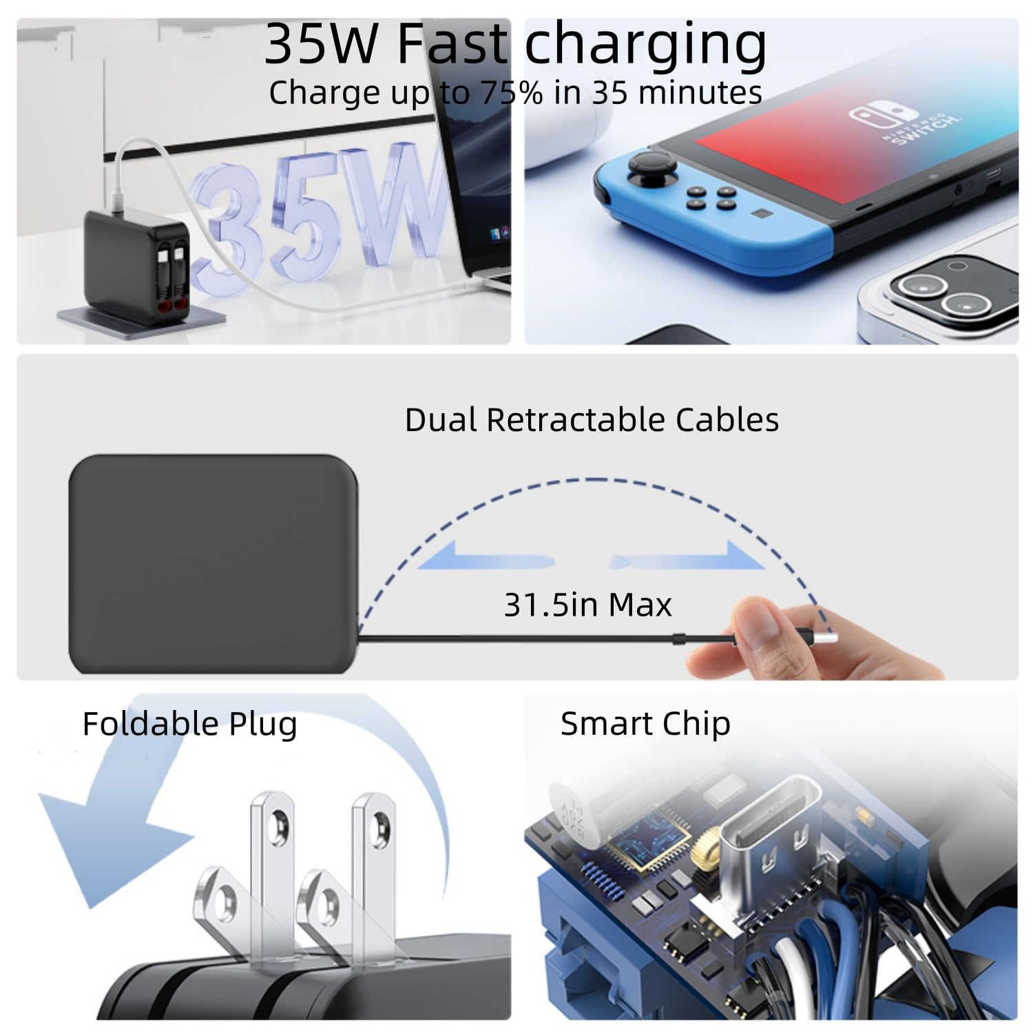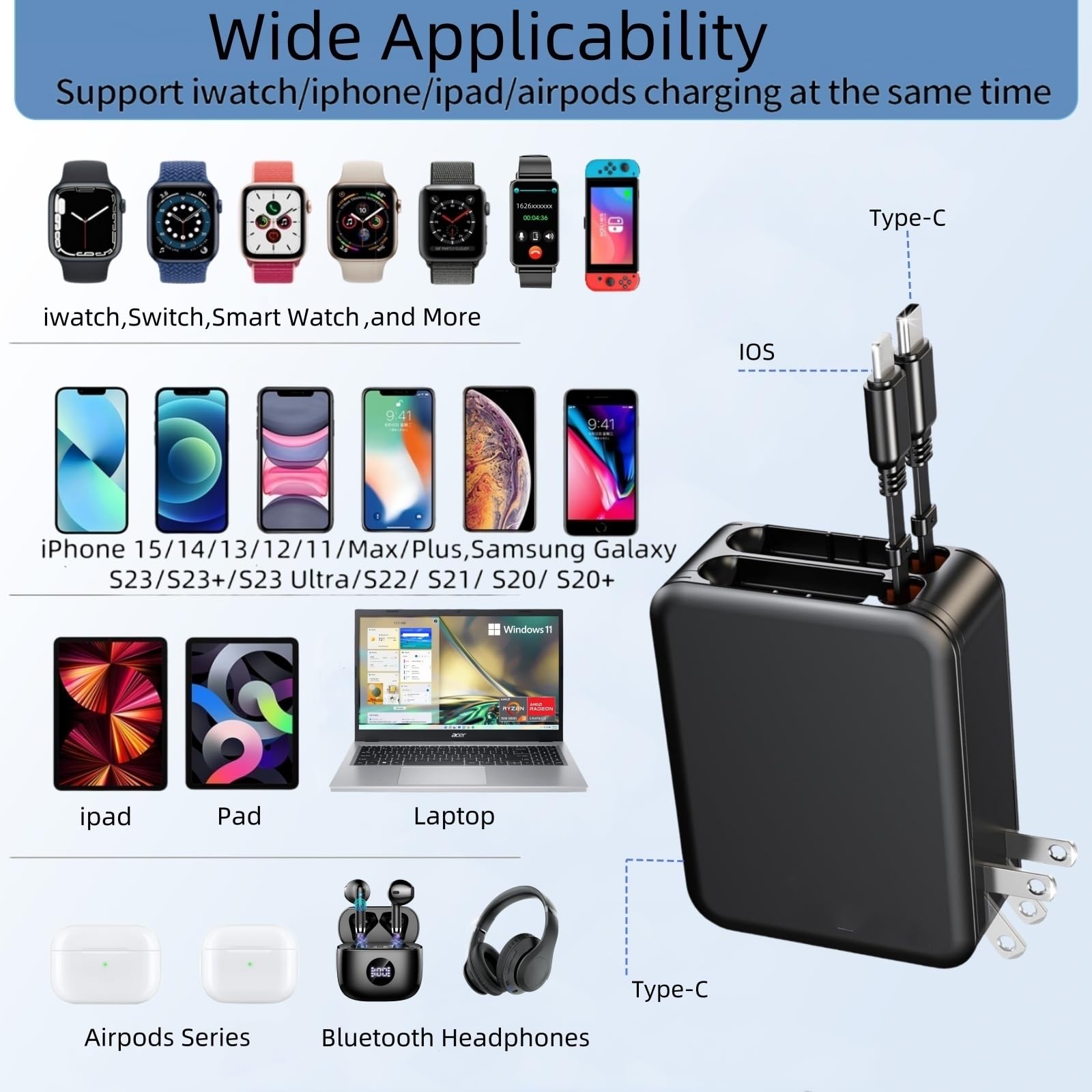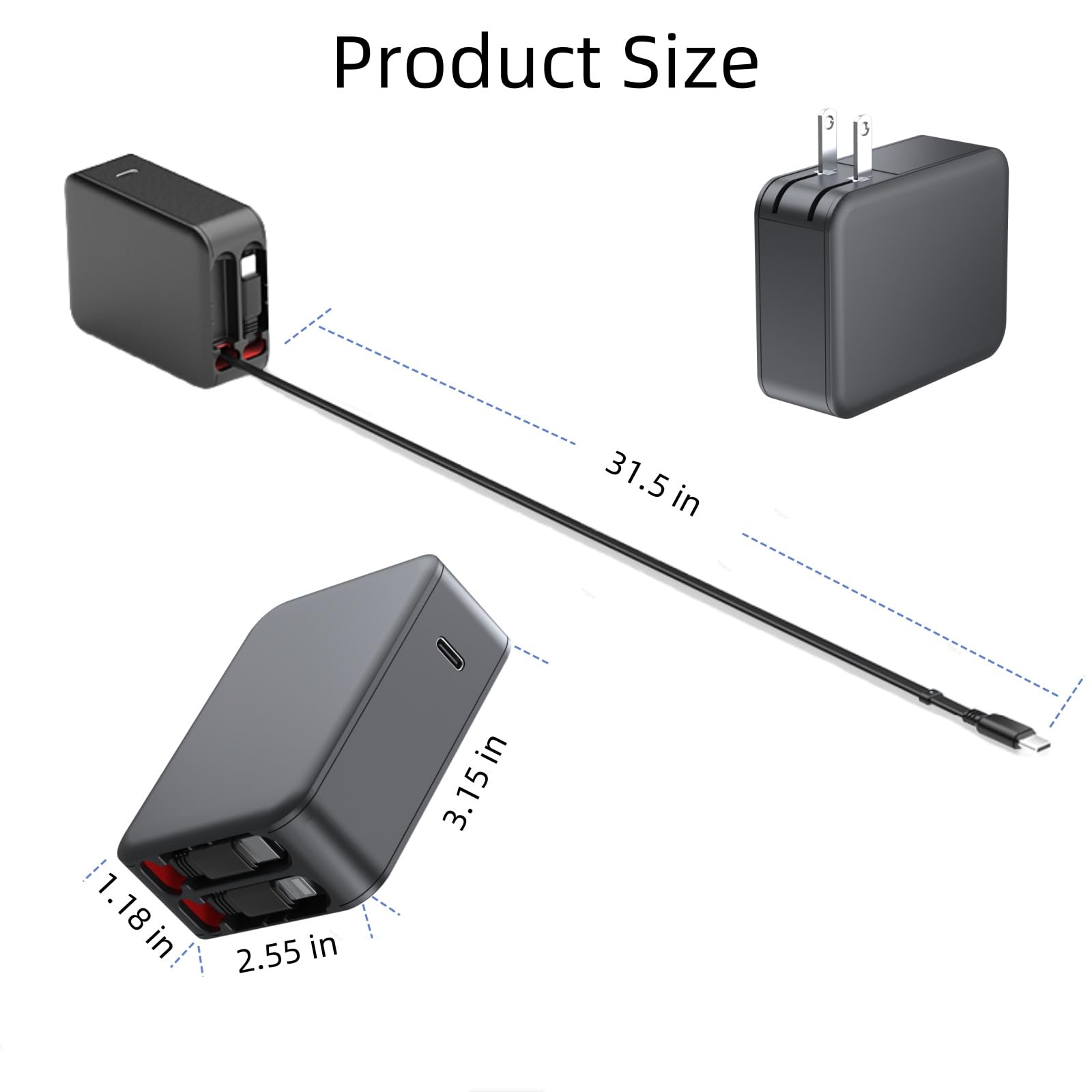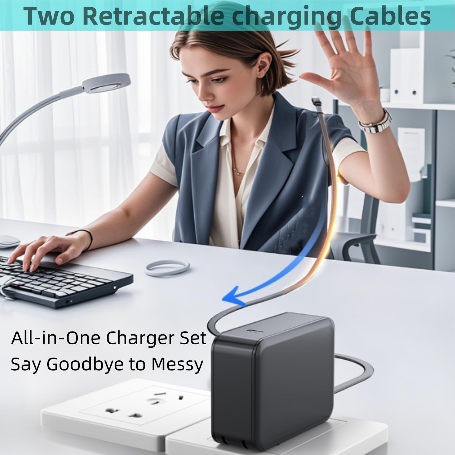 【Compact and Convenient】This versatile 3-in-1 wall charger comes equipped with two extendable cords (USB-C and Lightning), stretching up to 31.5 inches for hassle-free charging. The cords can be neatly tucked away when not needed, ensuring easy portability and making it perfect for travelers.