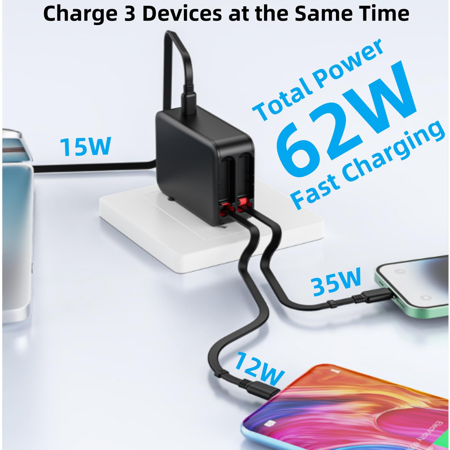 Retractable Wall Charger with Dual Cables,3 In 1 PD 62W USB C Fast Charging with Foldable Plug for iPhone 16/15/14/13/12/11 Series, Pad, LG, Samsung and More