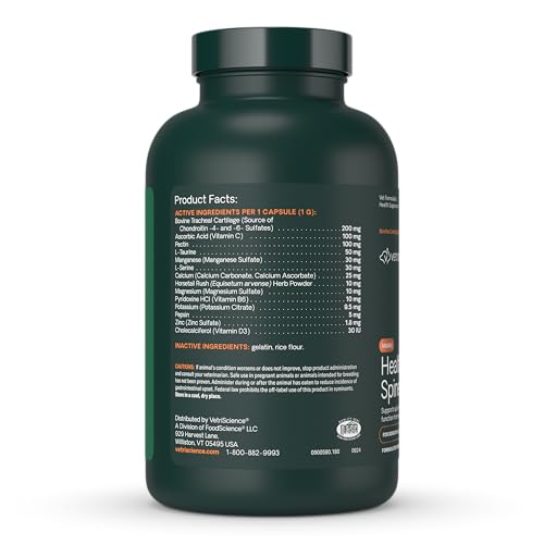 Healthy Spine & Disc (new name, same great Vetri Disc formula) is a unique supplement for dogs designed specifically to support connective tissues in the back and spine. It combines bovine tracheal cartilage with mineral sulfates, amino acids, vitamins, pepsin, and natural sources of silicon, which are all necessary for the support, maintenance, and health of connective tissue and spinal discs in dogs. Bovine tracheal cartilage is a natural source of chondroitin, which helps to support your dog's own cartilage, tendons, and ligaments in the back and spine. This spine support supplement for dogs also includes Vitamin C to support collagen production and help support joints, Vitamin D and Calcium to help support bone health, and Taurine to help support muscle health and growth. Horsetail rush herb power is a beneficial anti-inflammatory ingredient to help soothe everyday aches and pains in dogs with back discomfort. VetriScience Healthy Spine & Disc is an easy add to any supplement routine: the easy-open capsules are convenient to hide in a pill-hiding treat, or to open and sprinkle the flavorless, odorless powder into your dog's bowl. Dog breeds that are predisposed to back pain - including Dachshunds, Corgis, Frenchies, German Shepherds, and Spaniels - may benefit the most from this vet-formulated back supplement for spinal health. Our dog and cat supplements are certified by the National Animal Supplement Council (NASC), routinely undergo third-party testing, and contain no hidden ingredients, artificial flavors, synthetic colors or preservatives.