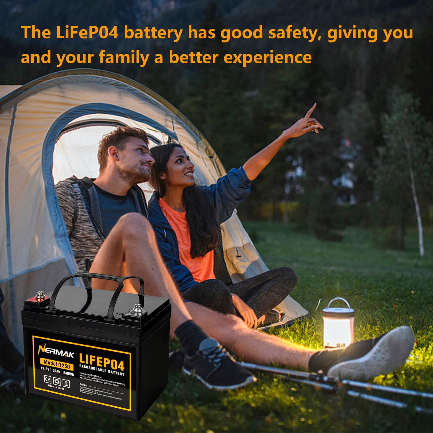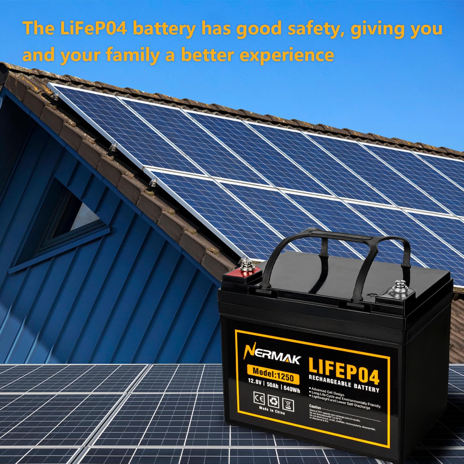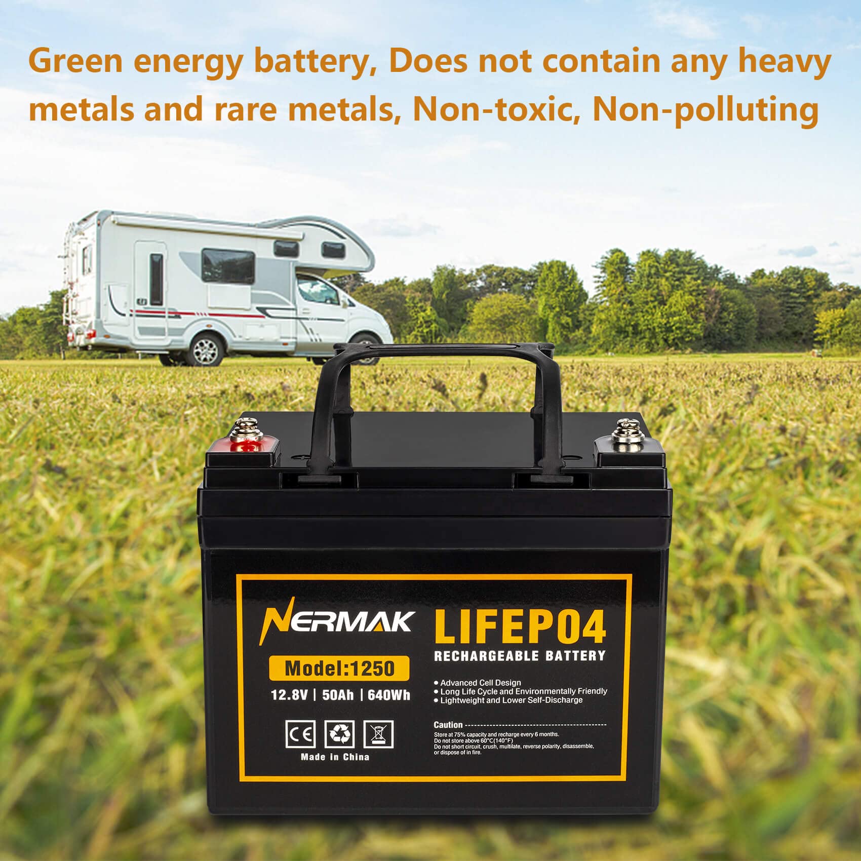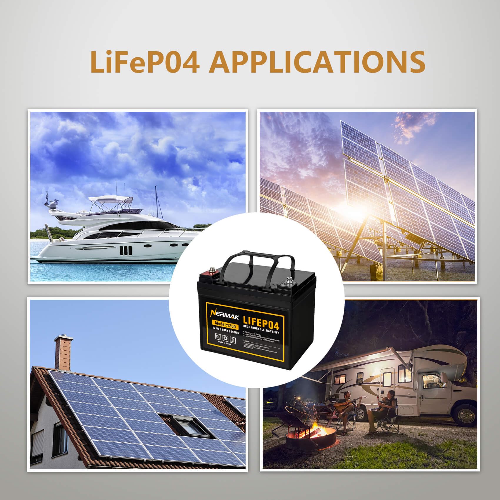 【Superior Performance】: Lithium iron phosphate battery has high energy density, Long cycle life, Good safety performance, No memory effect, etc. NERMAK LiFePO4 battery has built-in 100A BMS protection to prevent overcharge, Over-discharge, Over-current and short circuit, and excessive low self-discharge rate ensuring up to 1-year maintenance-free storage.