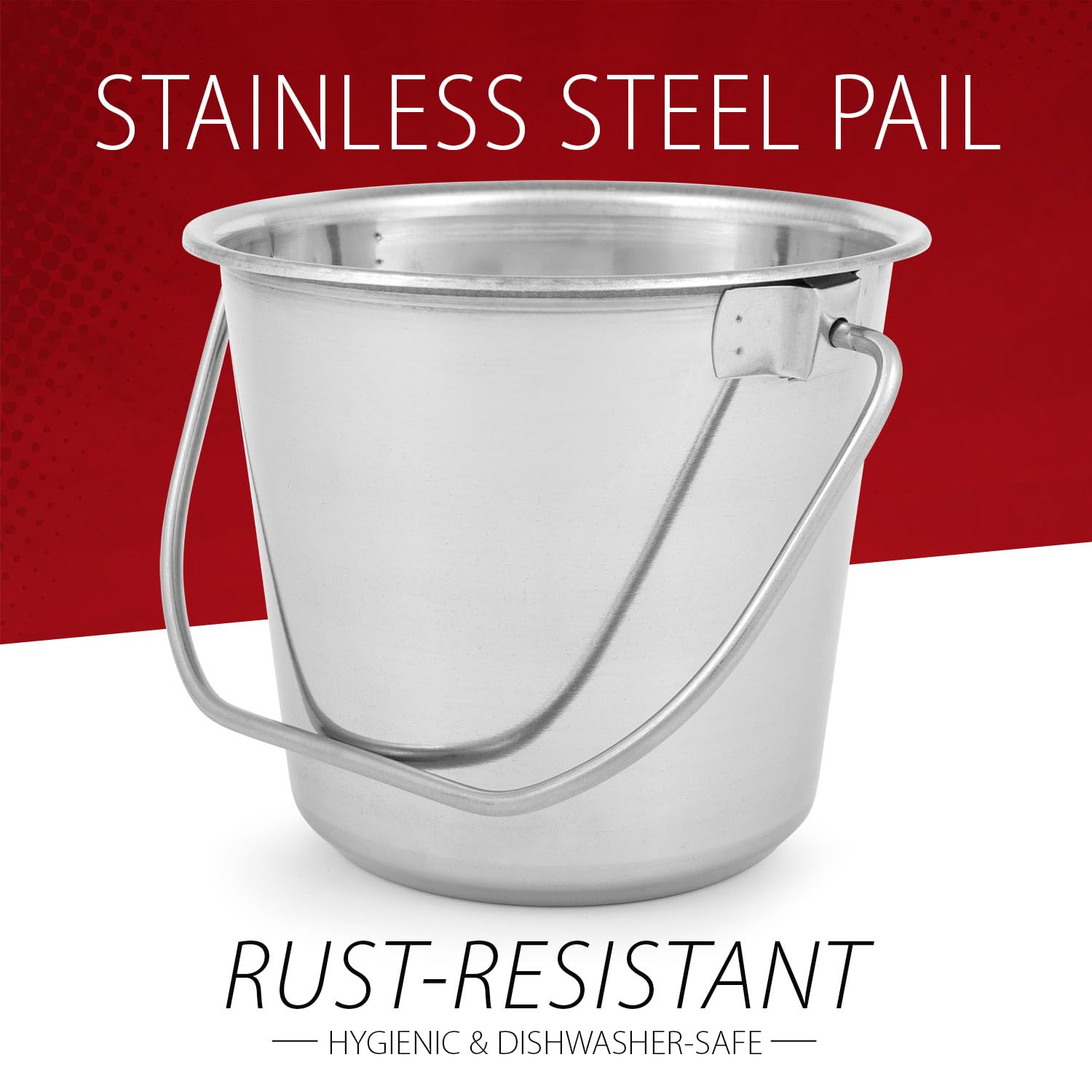 STAINLESS STEEL CONSTRUCTION - round design, rust resistant stainless steel bucket with durable handle; ideal for home, barn, stable, chicken coop, dairy, goat farm, garage, or workshop.
