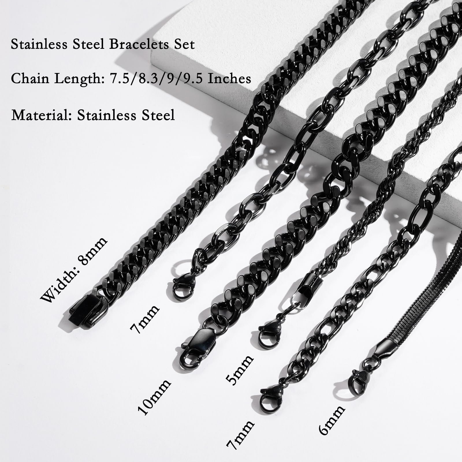 Size: The rope chain width: 5mm, paperclip chain width: 7mm, figaro chain width: 7mm, herringbone chain width: 6mm, cuban chain width: 8mm and 10mm. The bracelets length 7.5/8.3/9 inches, special size with 6.5/7 inches. Not only fit men wrist size but also women.