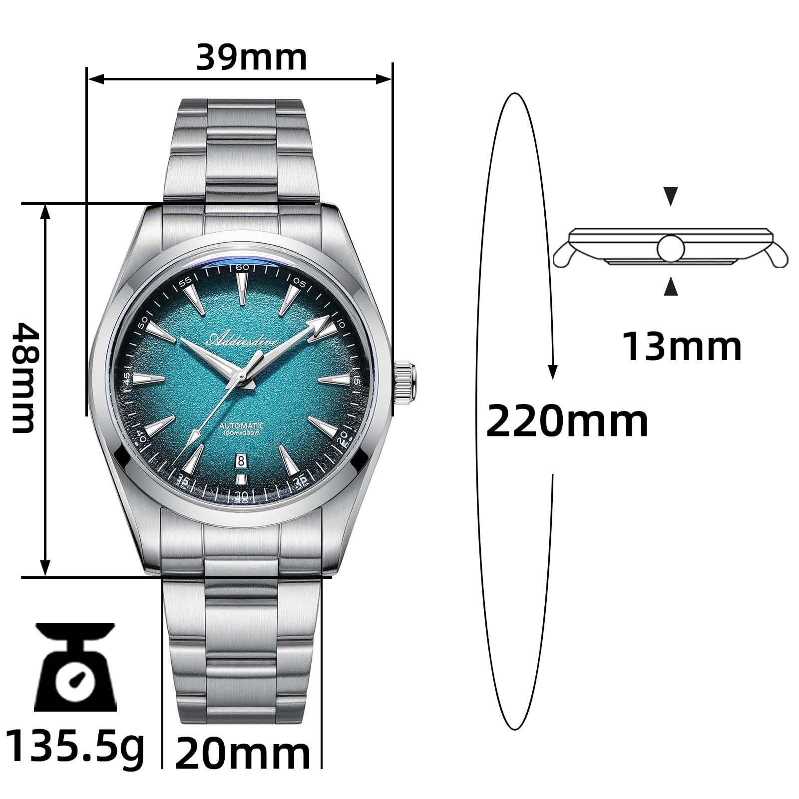 Size: 39 mm case diameter,38 mm bezel diameter,48 mm lug length, 13 mm thickness, 20 mm lug width, fits wrists up to 8.5 inches, with a micro-adjustable folding clasp
