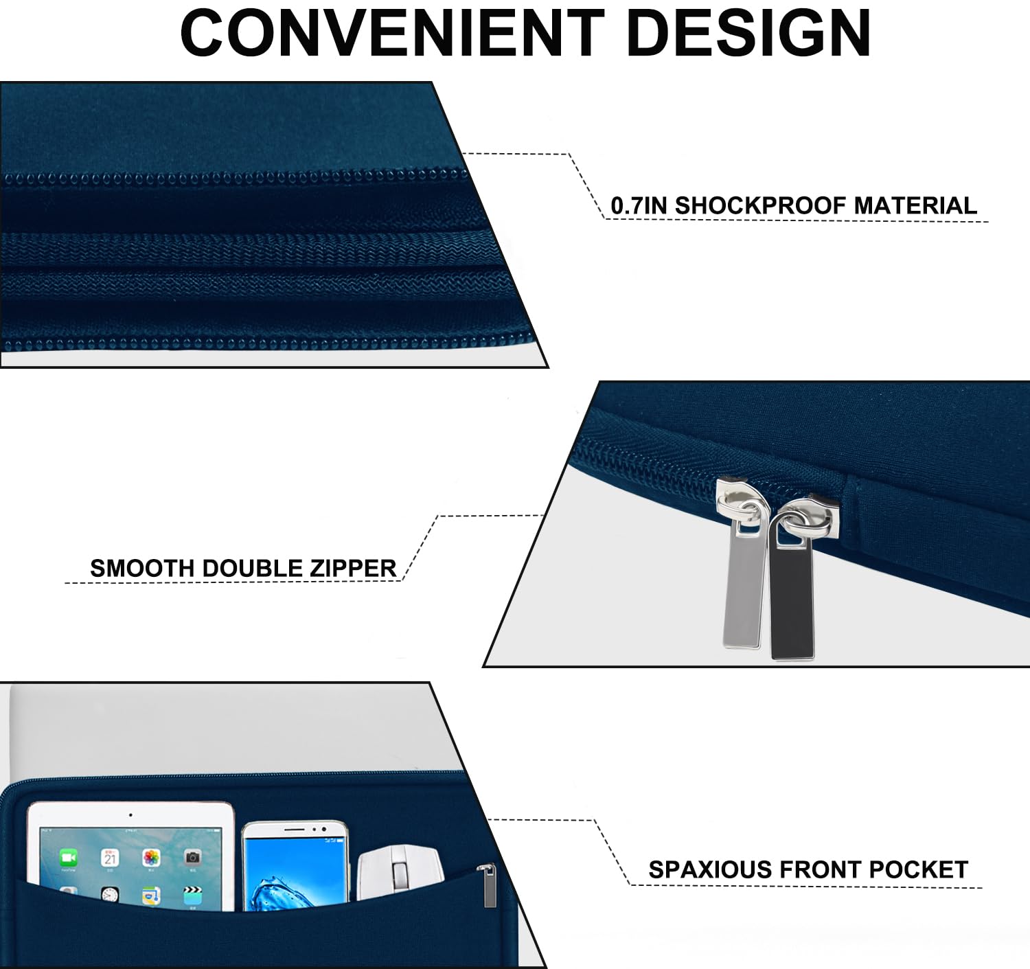 【Slim & Convenient】 Double-way zipper closure allows you to take laptop easily. Slim and lightweight makes it easier to slide into your tote bag, briefcase, backpack or other bag. Top-loading zipper on the sleeve glides smoothly and allows convenient access to your laptop computer.