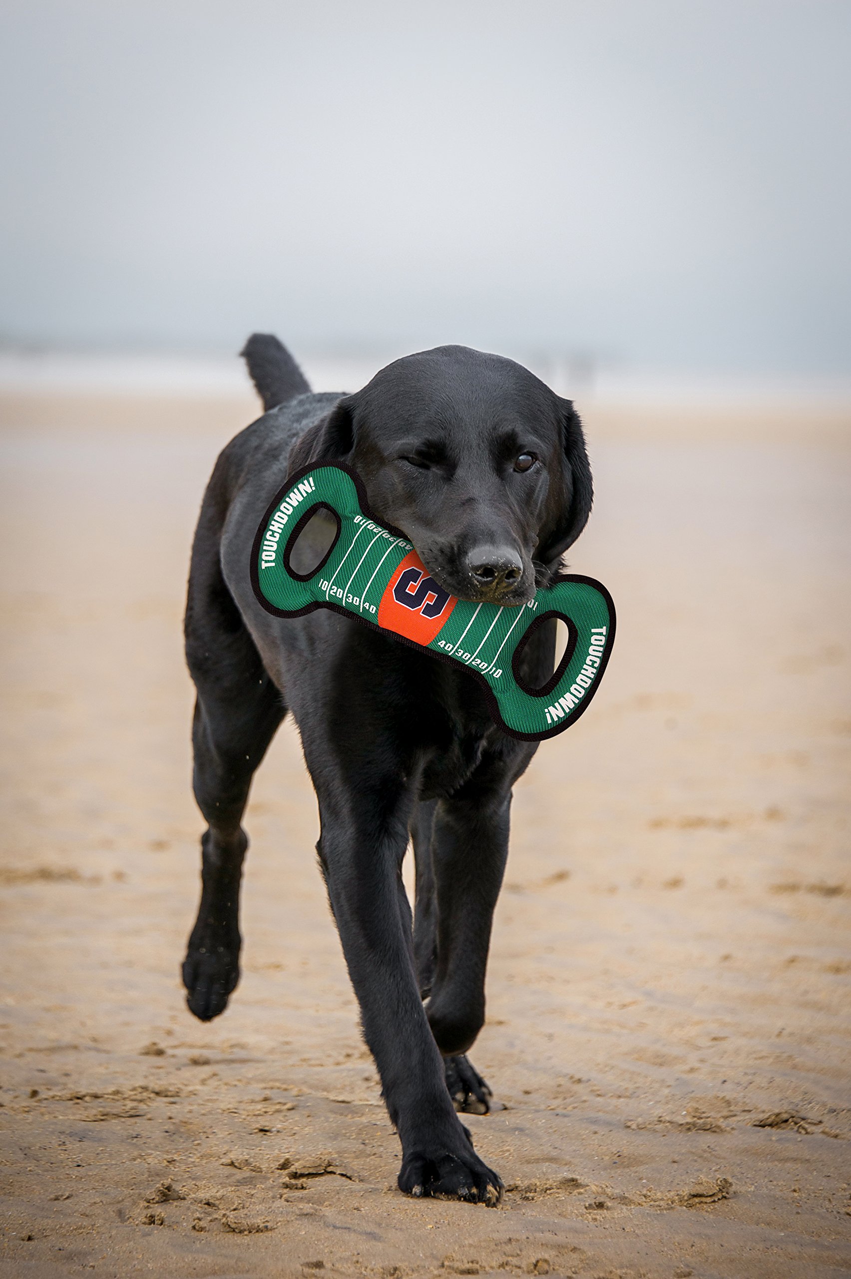 Show support for your favorite team while having fun with your sporty pup! This College Team Field pull toy is made out of heavy duty nylon with a tough web trim. Tuggable squeaker for dogs that love to play and squeak their dog toys. Great for strong chewers and provides hours of play and exercize! SIZING & USE: This NCAA Licensed dog toy is approximately 13 inches long and 6 inches wide.