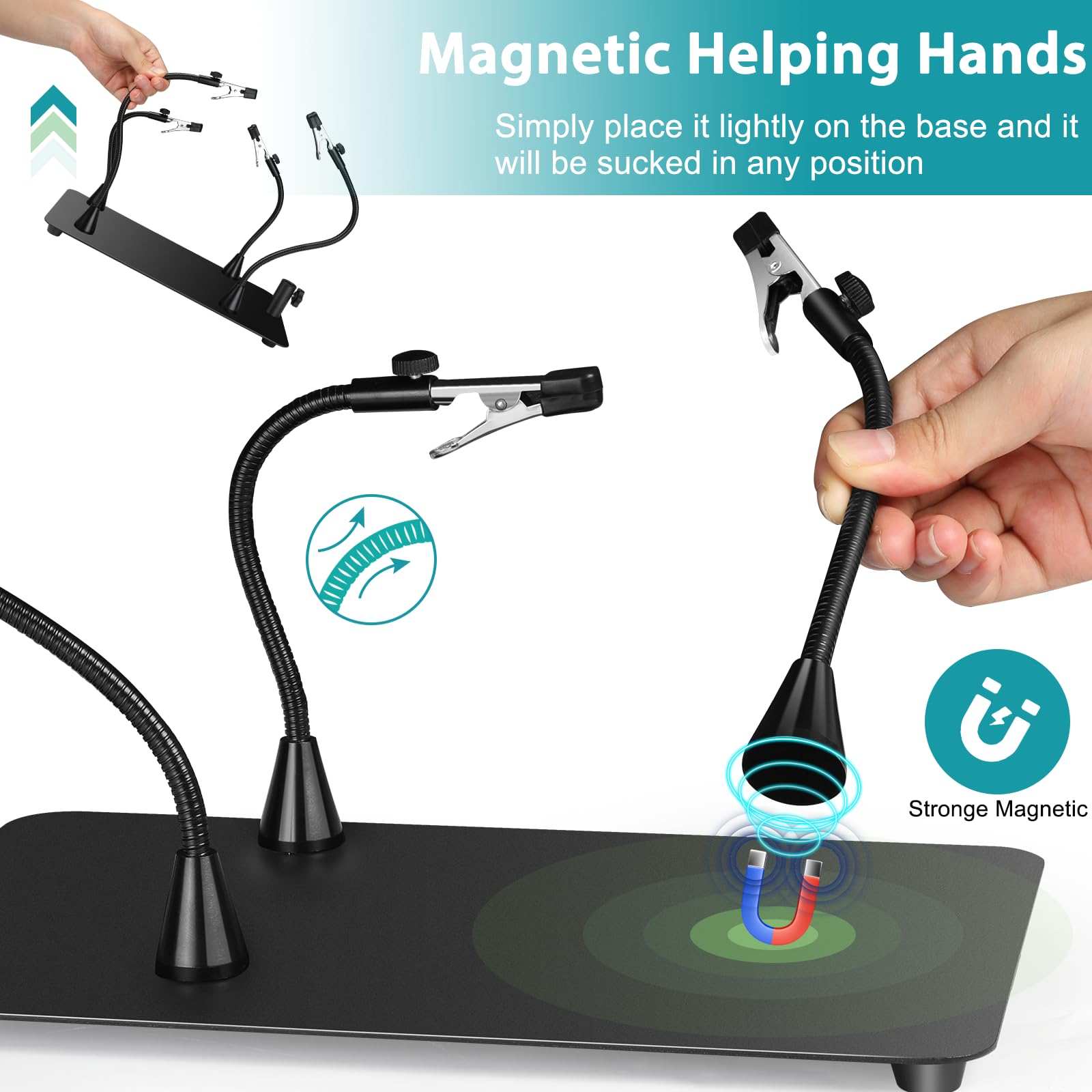 4 Super Magnetic Helping Hands: 2 long and 2 short flexible magnetic gooseneck arms can be your third hand, you can adjust by 360° bending and place anywhere on the base. We have enhanced the magnetic attraction of the helping hand, making it highly effective on the metal base. Two 12" and two 8.6" gooseneck helping hands tools adapt to any size project, completely freeing your hands.
