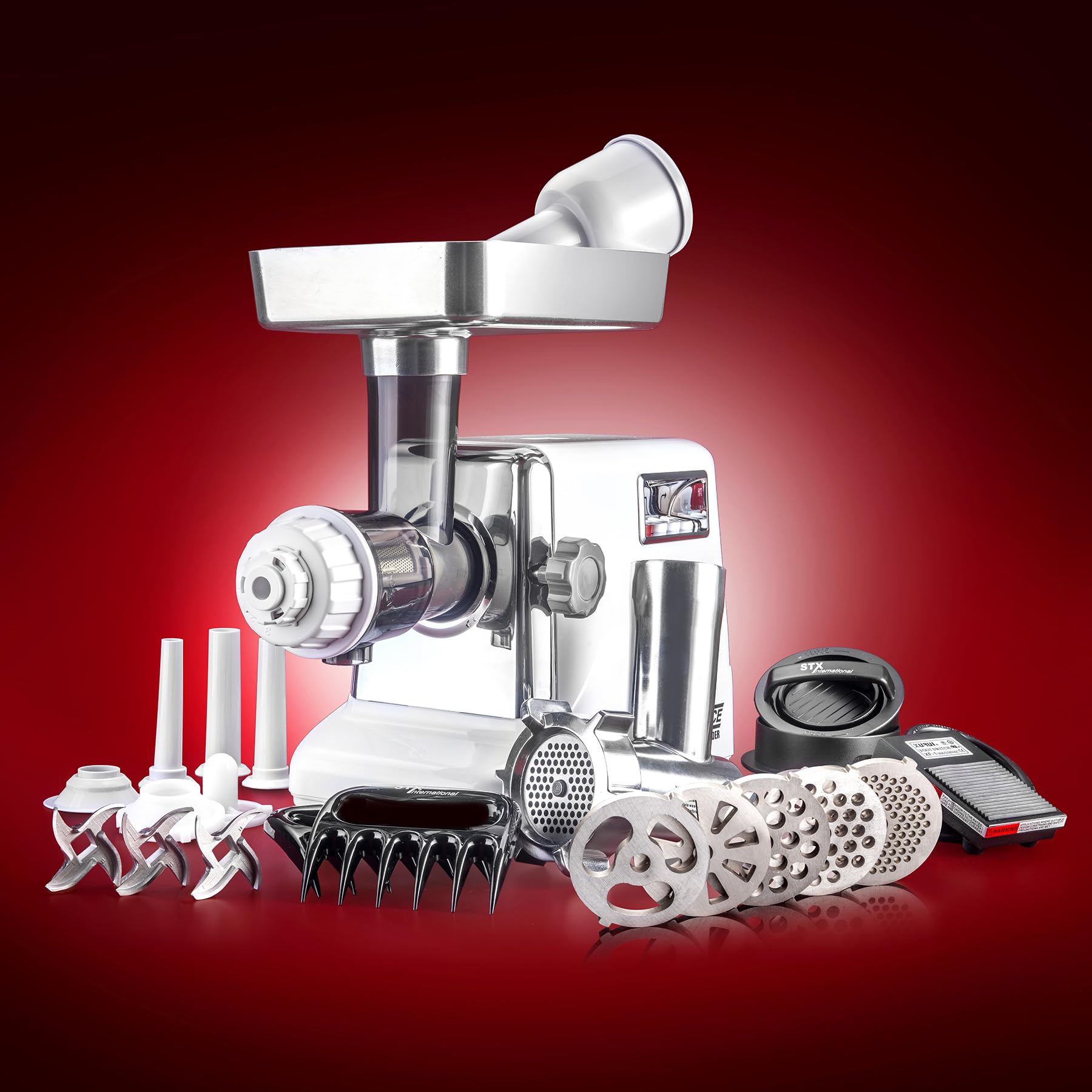 WHAT'S INCLUDED?: This Turboforce 3000 Series Classic Includes: 1 - Size #12 Polished Aluminum (Food Grade) Grinding Head with Meat Hopper, 1 - Masticating Juicer Attachment, 1 - Foot Pedal (for Optional Use), 3 - 304 Grade Stainless Steel Cutting Blades, 5 - Sizes of Grinding Plates (Includes 1 - Sausage Stuffing Plate) 3 Sausage Stuffing Tubes (1/2", 5/8" & 3/4"), 1 Kubbe Maker, 2 Meat Shredder/Holder Claws and a 3-in-1 Burger & Slider Maker Press.