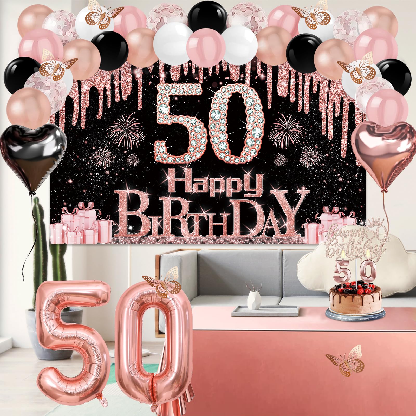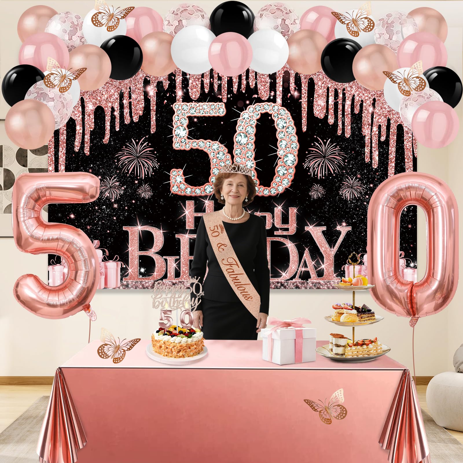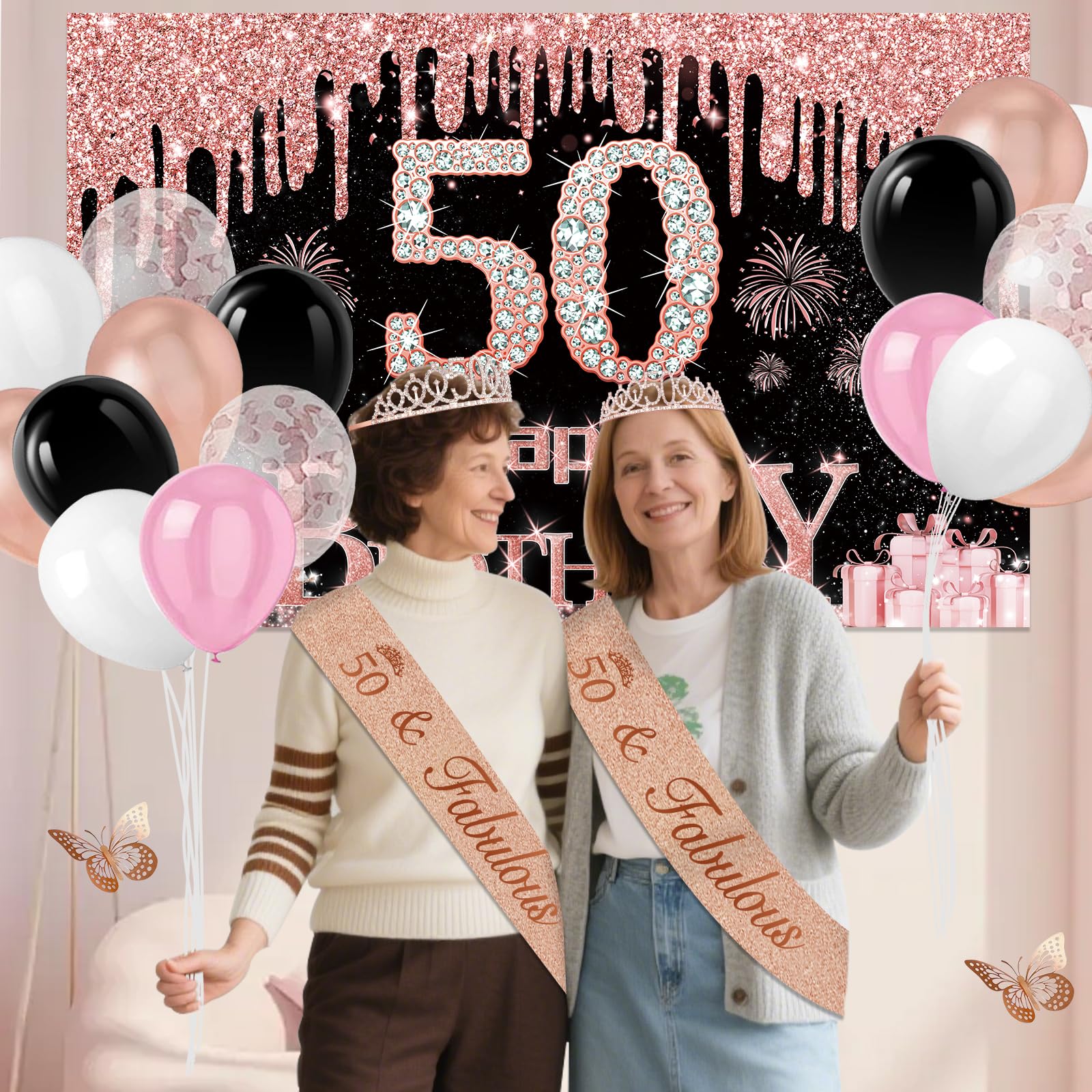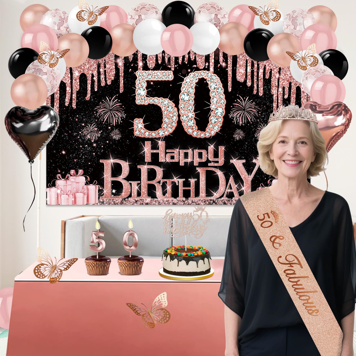 50th Birthday Decorations: Package coming with 50th Birthday Banner *1pc, 50th Birthday Tiara *1pc, 50th Birthday Sash *1pc, 50th Birthday Cake Topper *1pc, 50th Birthday Candles *1set, Rose Gold Butterflies *8pcs, Number 50th Birthday Balloons *1set, Love-Shape Balloons *2pcs, Latex Balloons * 30pcs, and Rose Gold Tablecloth *1pc. This complete 49pcs 50th birthday party decoration pack is the best way to meet different decorating needs