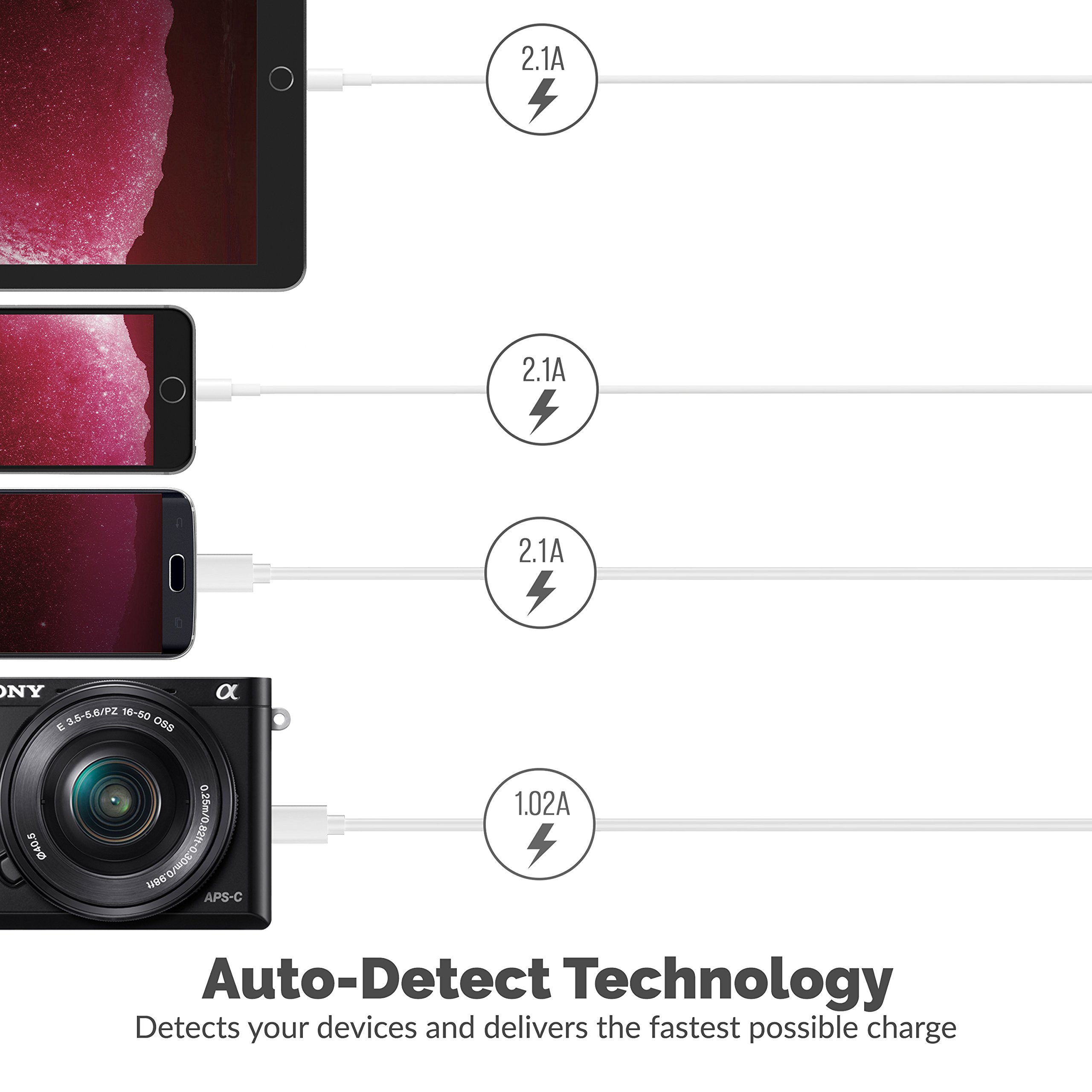 Smart port technology maximizes compatibility with Android, Apple and other devices by enabling charging speeds of up to 12 amps among 6 ports or 2.4 amps per port.