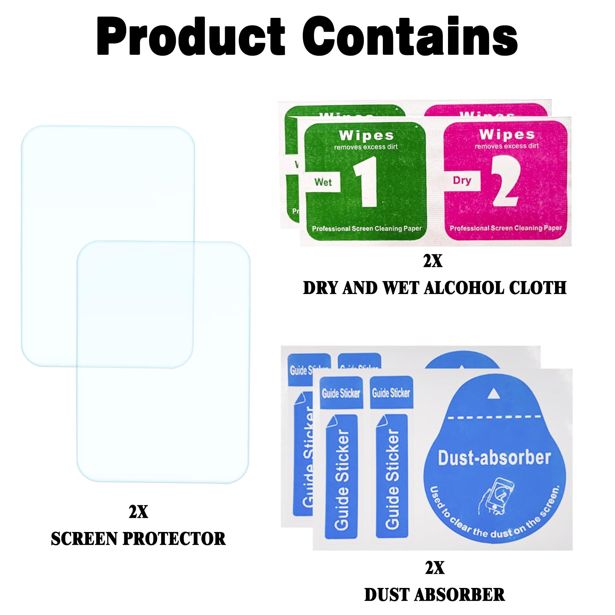 High Quality: Made by the high quality Tempered Glass; Doesn't affect the sense of touch or the vision 2 x Screen Protection Film;2 x Alcohol Prep Pad; 2 x Dust Absorber"