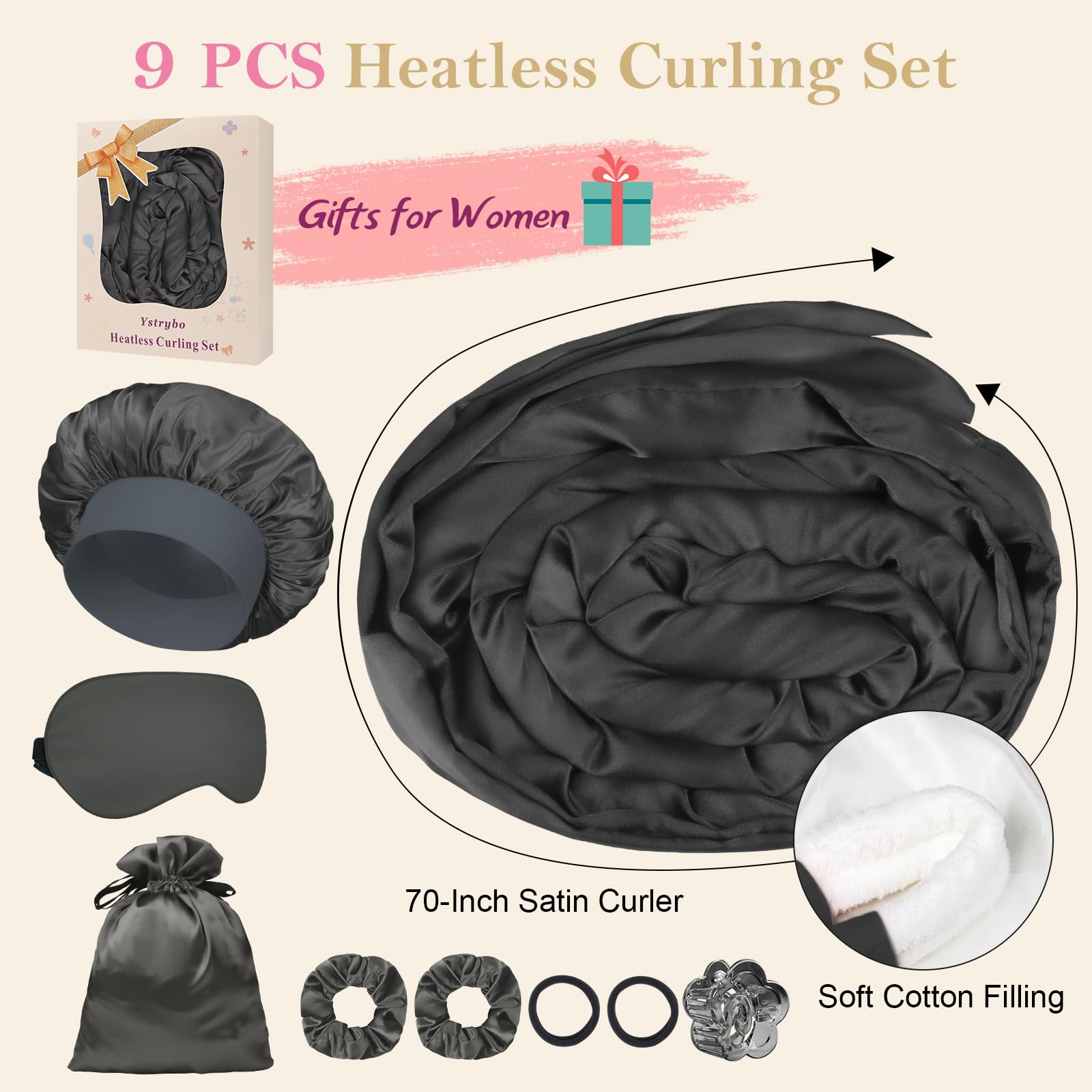 9 Pcs Hair Curler Set: All-in-one kit includes a heatless curling headband, a floral hair clip, a storage bag, a hair bonnet, an eye mask, two satin scrunchies, and two elastic hair ties. This heatless curling set is suitable for all hair types
