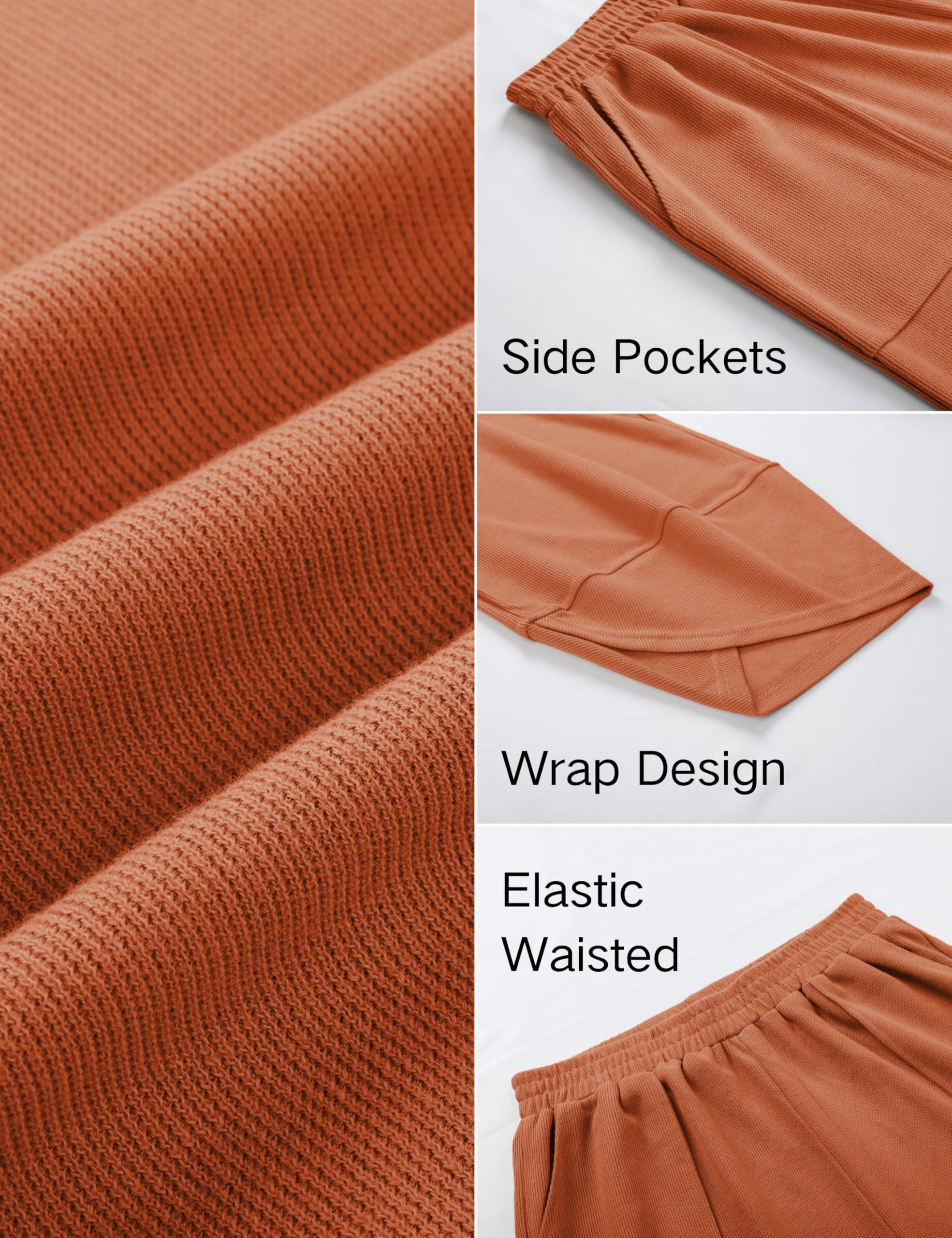Features: Elastic waist, side seamed pockets, wrap design at hem