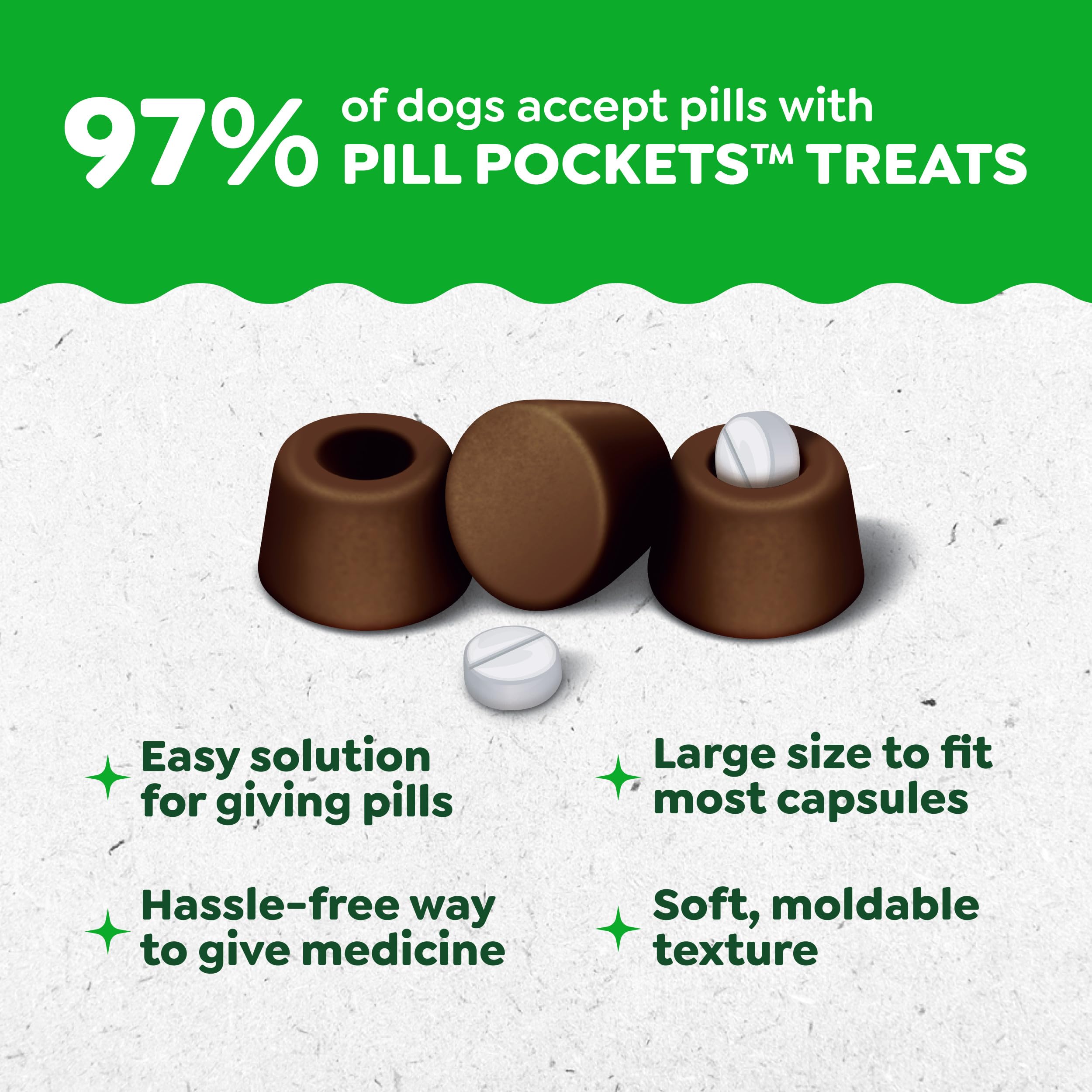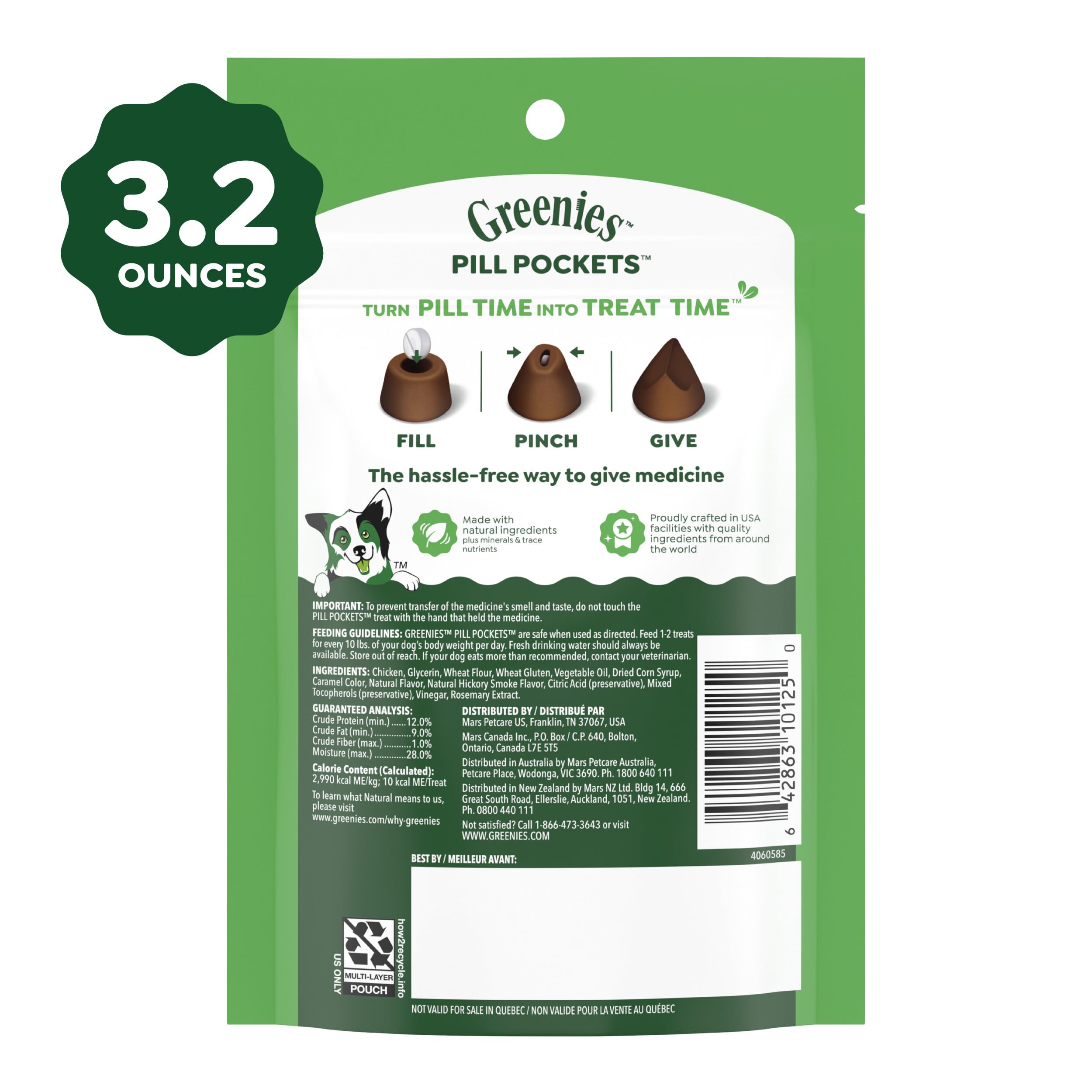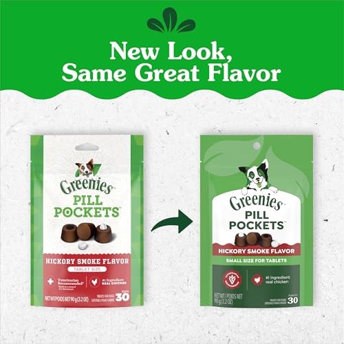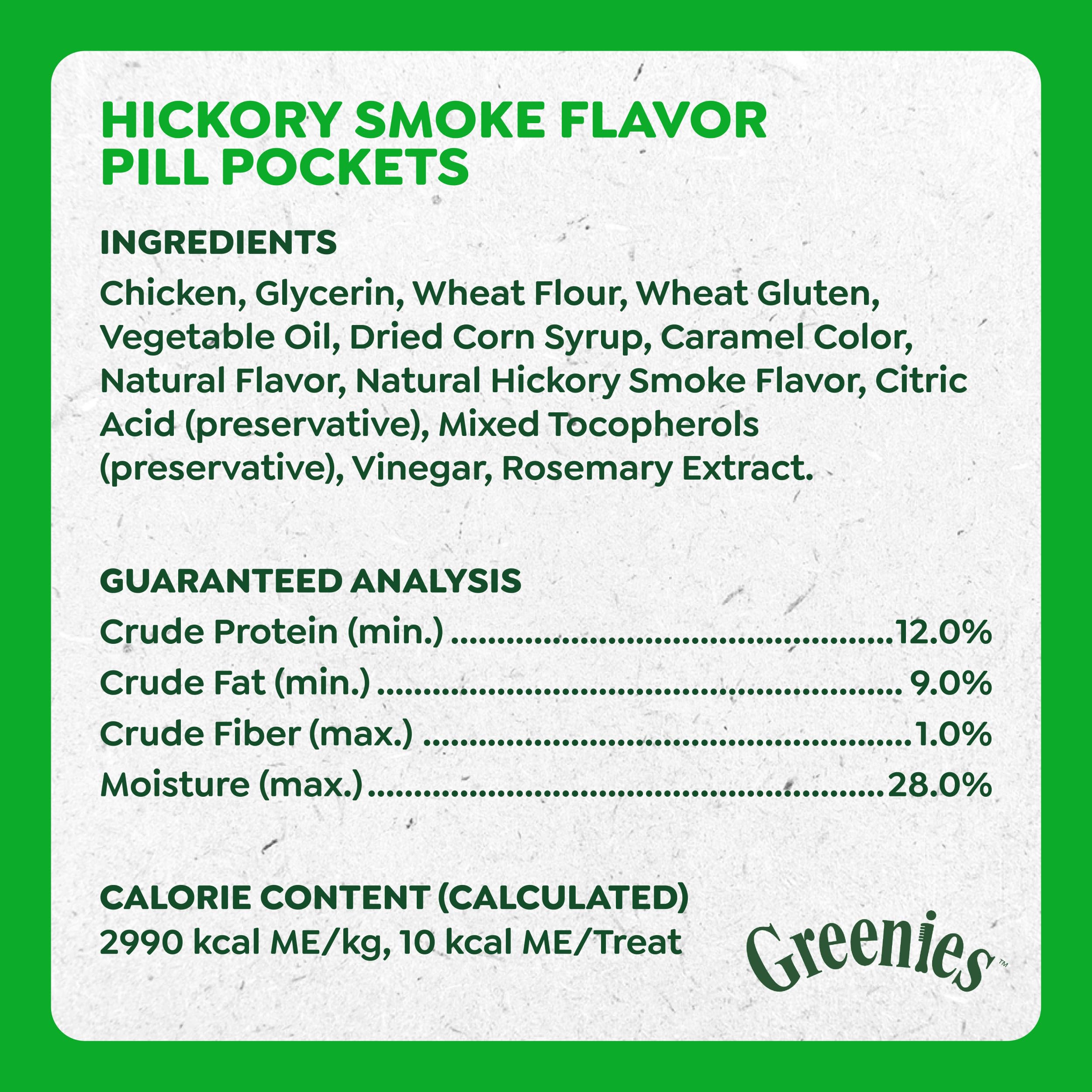Product Description Turn pill time into treat time! Greenies Pill Pockets Treats are the #1 veterinarian-recommended choice for giving pills, based on a survey of US Veterinarians, making them a convenient pill pocket treat for pet owners, dog parents, and dog caregivers interested in everyday pet care. Why hide your pet's medicine in human foods like hickory smoke or cheese when you can give them a dog treat that works as a medicine-concealing treat, made with natural ingredients plus minerals and trace nutrients? Greenies Pill Pockets Hickory Smoke Flavor Dog Treats ensure a tasty experience and take the hassle out of giving your canine companion medicine by concealing medication and helping deliver medication when you need to conceal pills. Whether for large breeds or small dogs, these small-sized tablet pill pockets function as simple pill pouches or medicating pouches that make taking medicine a positive experience for your dog. And they're easy to give: Drop a tablet into the small dog treats to hide medicine, pinch the top to close, give it to your dog, and watch their medicine disappear. Greenies Pill Pockets dog treats are the easy way to give your dog their meds--and they'll never know the difference, offering everyday convenience for those who give medication regularly. Amazon.com GREENIES PILL POCKETS Treats are the number-one vet-recommended choice for giving pills.* One of the best ways to get your dog to take medicine is to hide the tablet inside a tasty treat. GREENIES PILL POCKETS Treats have built-in pouches to easily hide medicine and ensure your dog takes it. These all-natural treats are a healthier alternative to using human foods, because they have fewer calories and less fat and sodium. Make medicine-giving more enjoyable for both you and your dog.