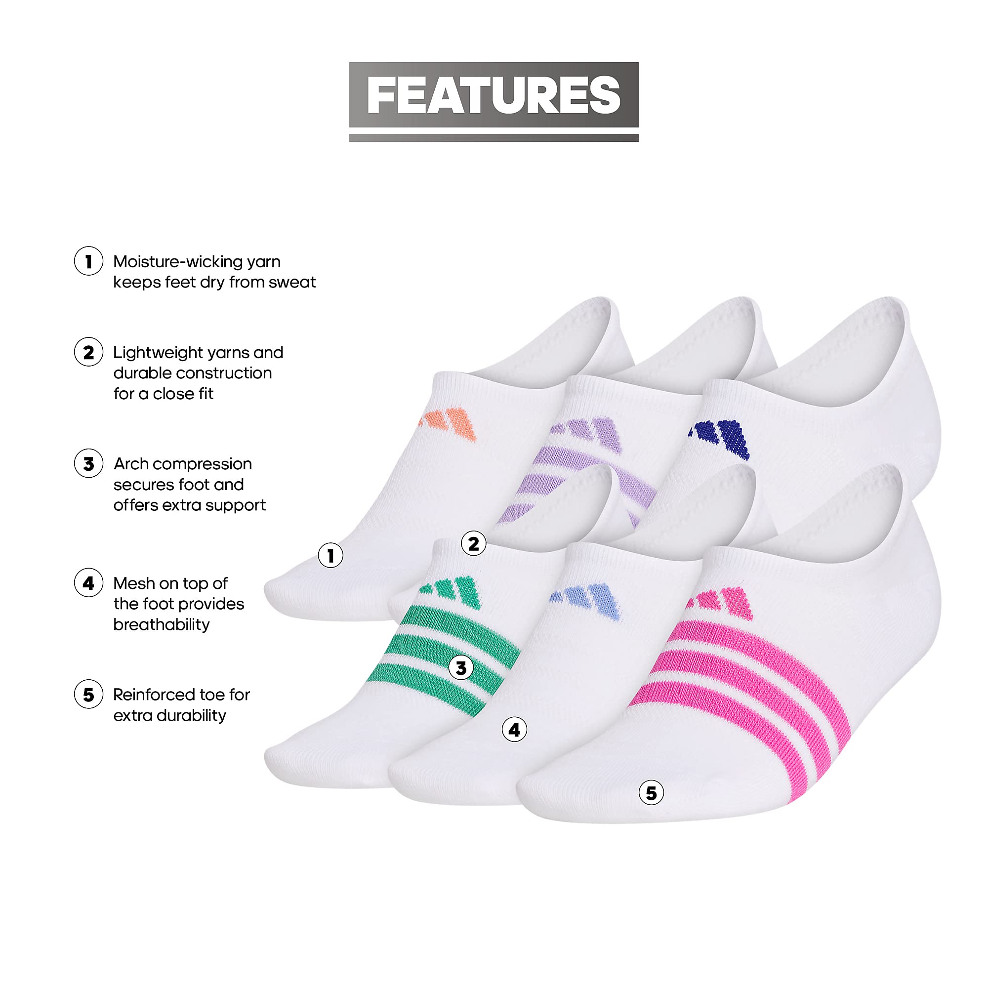 Keep your feet cozy and dry wearing the adidas Superlite II 6-Pack Super No Show socks.