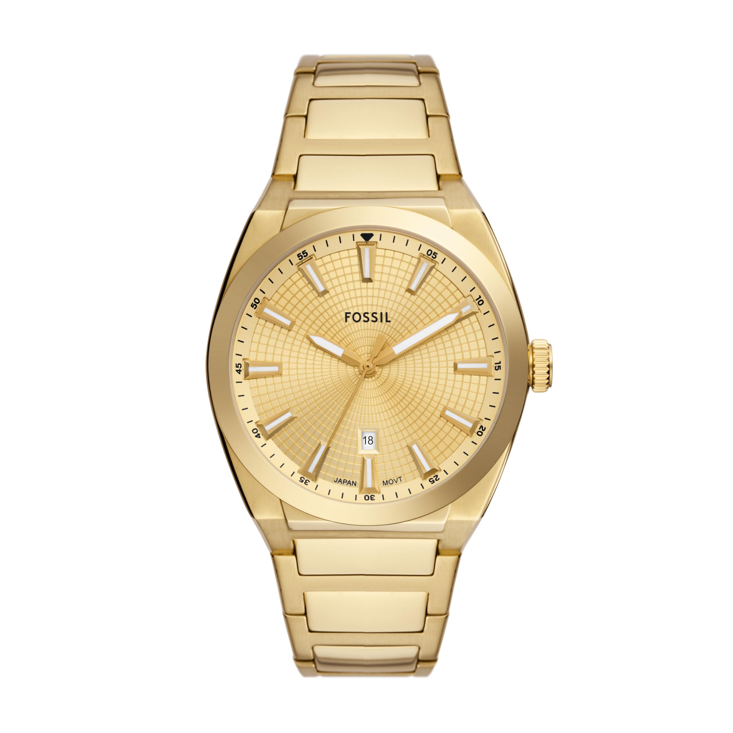 SPORT-INSPIRED DESIGN: This 42mm Everett Fossil watch for men features a textured dial, three-hand date movement and quality bracelet; sporty and sleek, it recalls vintage roadsters, and its solid-steel build ensures durability