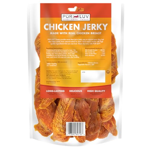 PUR LUV Chicken dog jerky treats satisfy your dog’s craving for real chicken and their natural desire to chew; dogs love chicken jerky treats and the flavor that comes from the real whole protein chicken breast, which makes Pur Luv treats so special