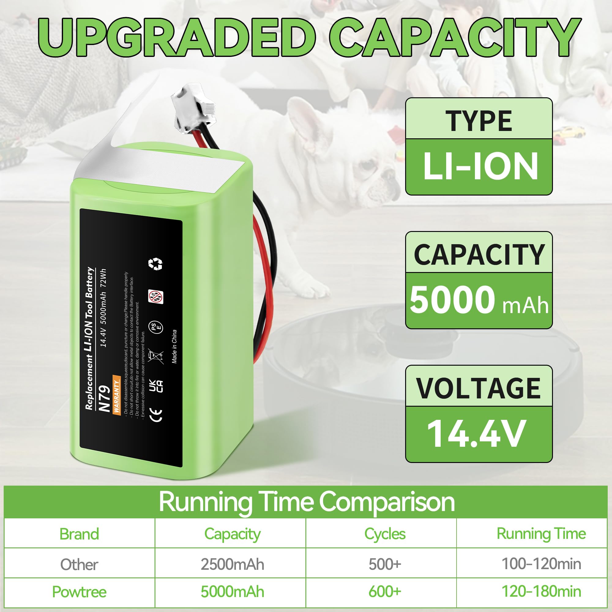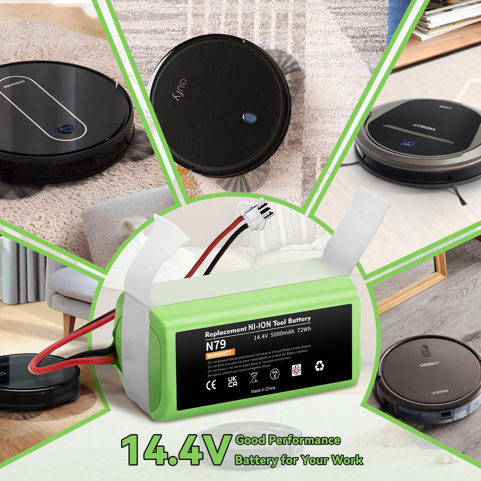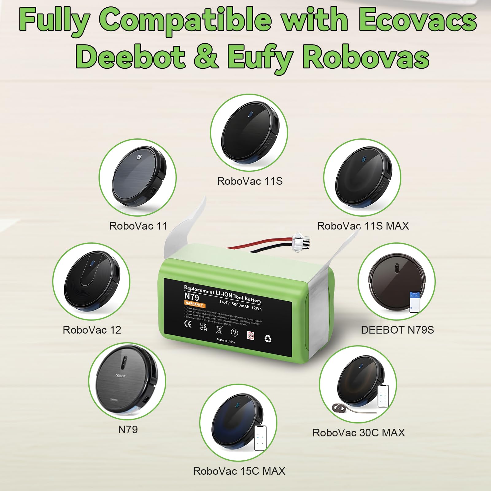 š³ćBattery TypećBattery type: Li-ion battery, Voltage: 14.4V, Capacity: Upgraded 5000mAhļ¼No Fake High Label Capacityļ¼. Compatible with G40+, G40Hybrid+, RoboVac 11, 11S, 11S Plus, 11S MAX, 12, 15C MAX, 15C,25C 30, 30C, 30C MAX, G10 Hybrid, G20 Accessory and for Ecovacs Deebot N79S, N79, DN622, etc. Please confirm the model before buying