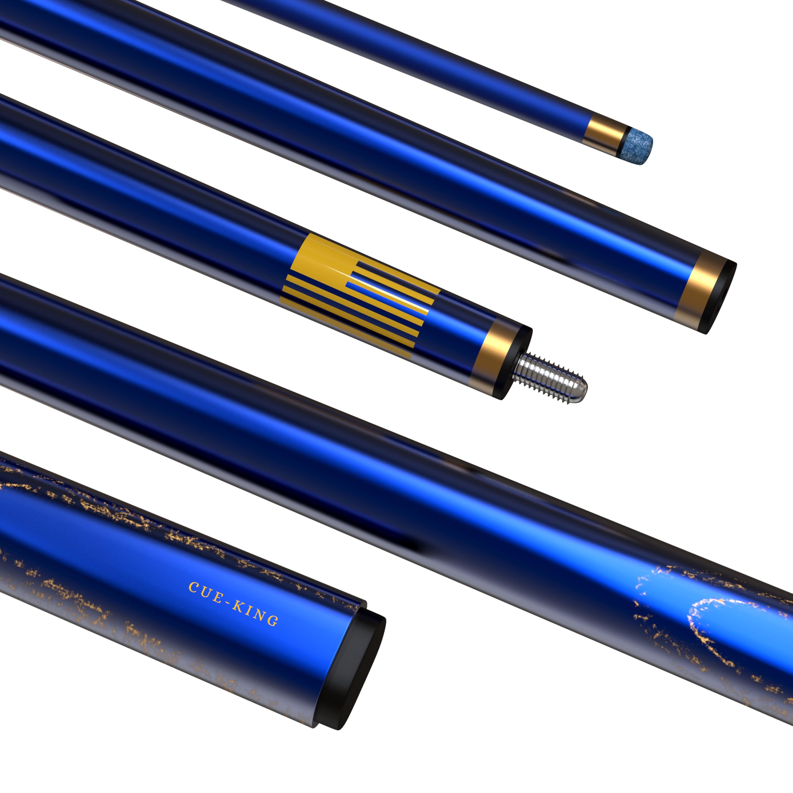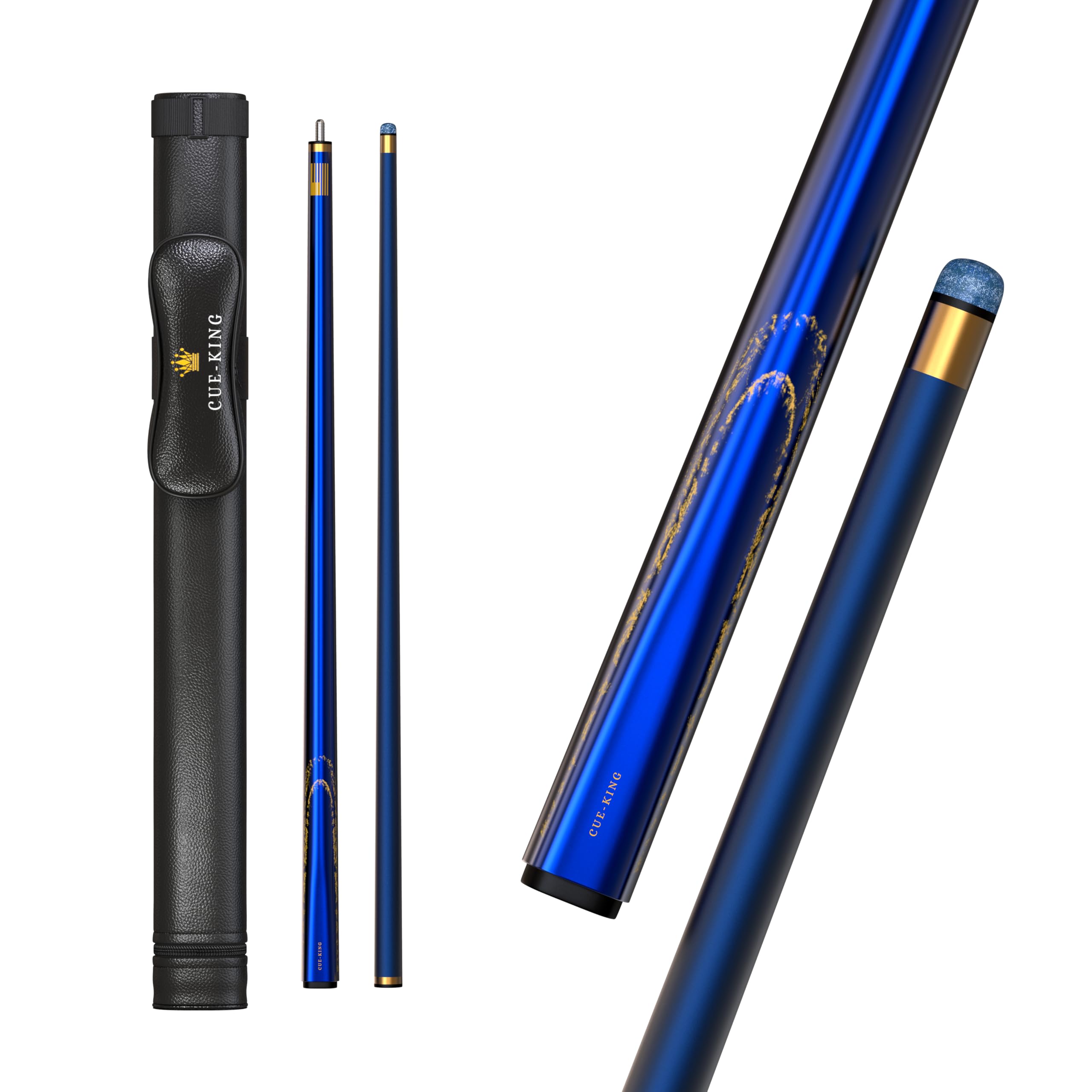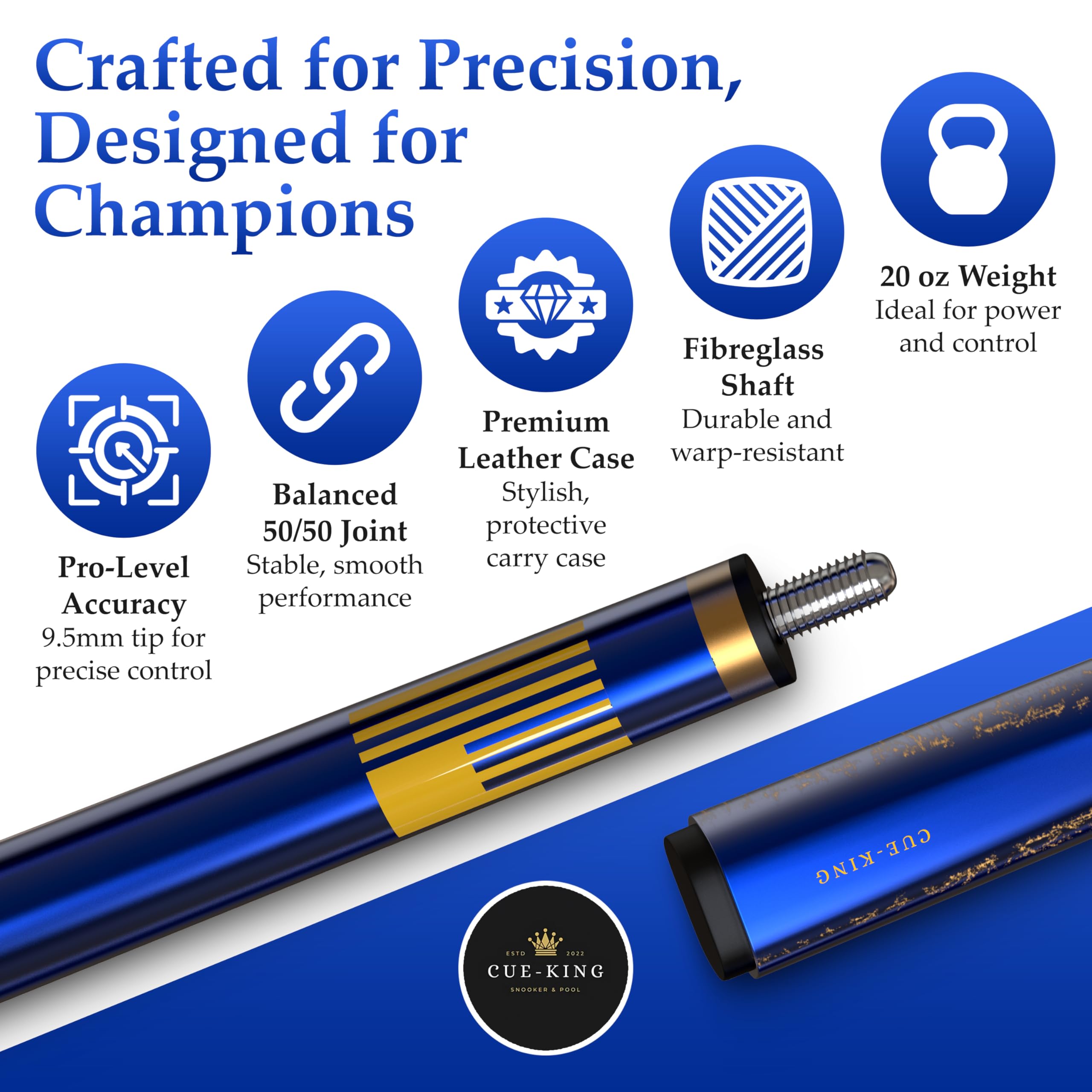 Cue-King Premier 2.0 Pool Cue with Leather Case Specifications - 2 Piece, Fibreglass Construction, 58”, 20oz with 9.5mm Premium Tip - Elevate your game with the Cue-King Premier 2.0 Billiard cue, a masterpiece crafted for precision and performance. Meticulously crafted from premium fiberglass, this cue embodies excellence in both construction and design. Exceptional Quality & Design - Experience the unparalleled craftsmanship that defines the Cue-King brand. The gloss blue shaft enhances durability and gives your cue a refined feel, ensuring optimal control and a smooth stroke and balanced cue. The flawless finish and attention to detail sets this cue apart with its stunning visual appeal and performance. Superior Performance - The Premier 2.0 is geared towards more experienced players as it has our professional grade 9.5mm tip. This enhances accuracy and control on the table allowing skilled players to reach their maximum potential when playing. Your Game, Your Advantage - With its striking design and superior quality, the Cue-King Premier 2.0 Cue stands as a testament to precision engineering and exquisite artistry. Elevate your gameplay and make a statement on the billiard table with this remarkable cue. Indulge in excellence with the Cue-King brand - where craftsmanship meets performance.