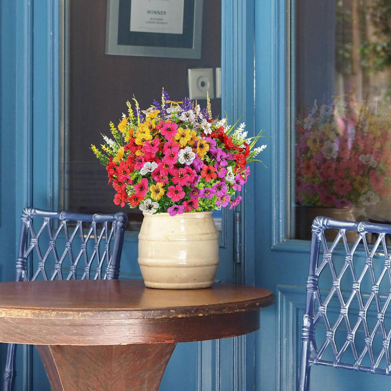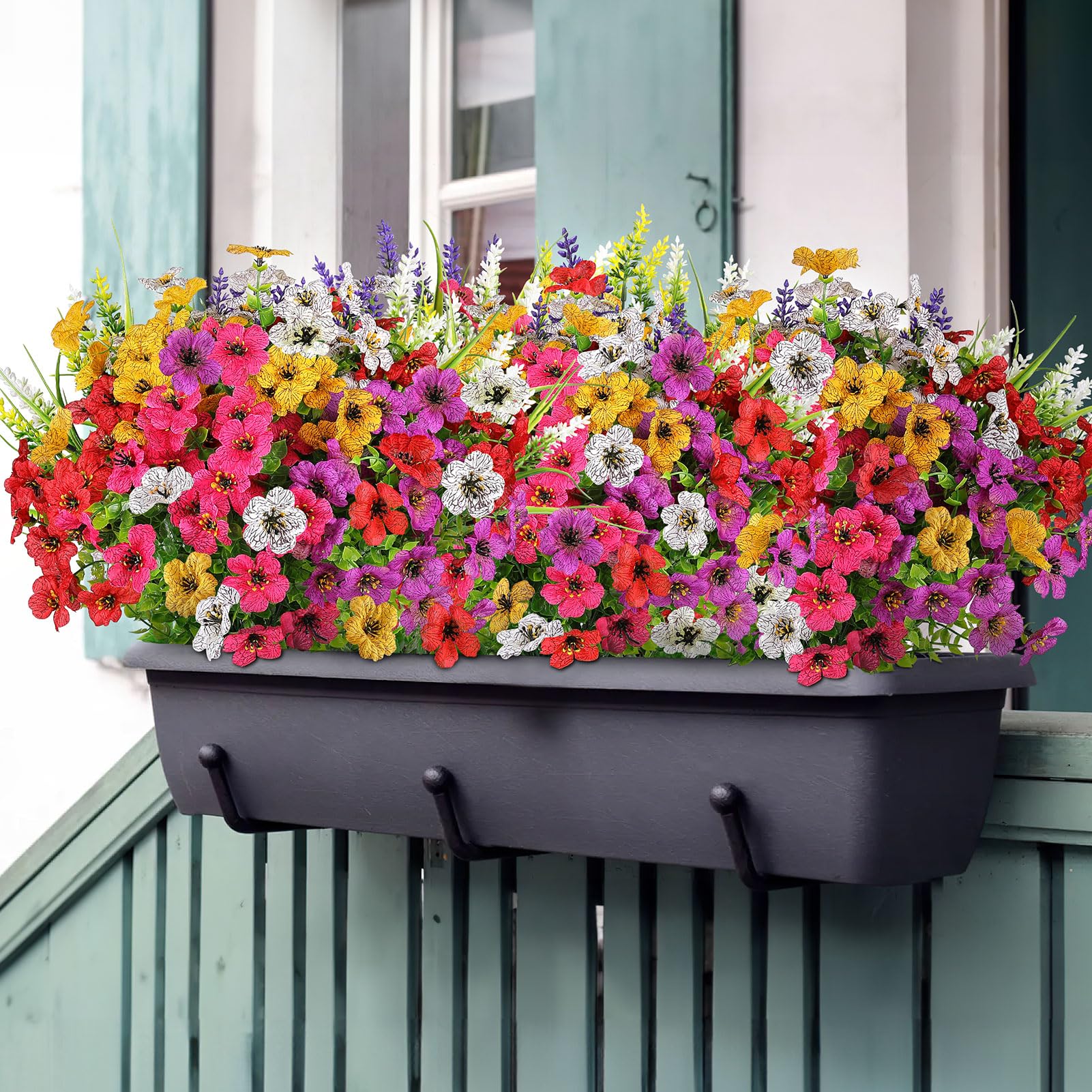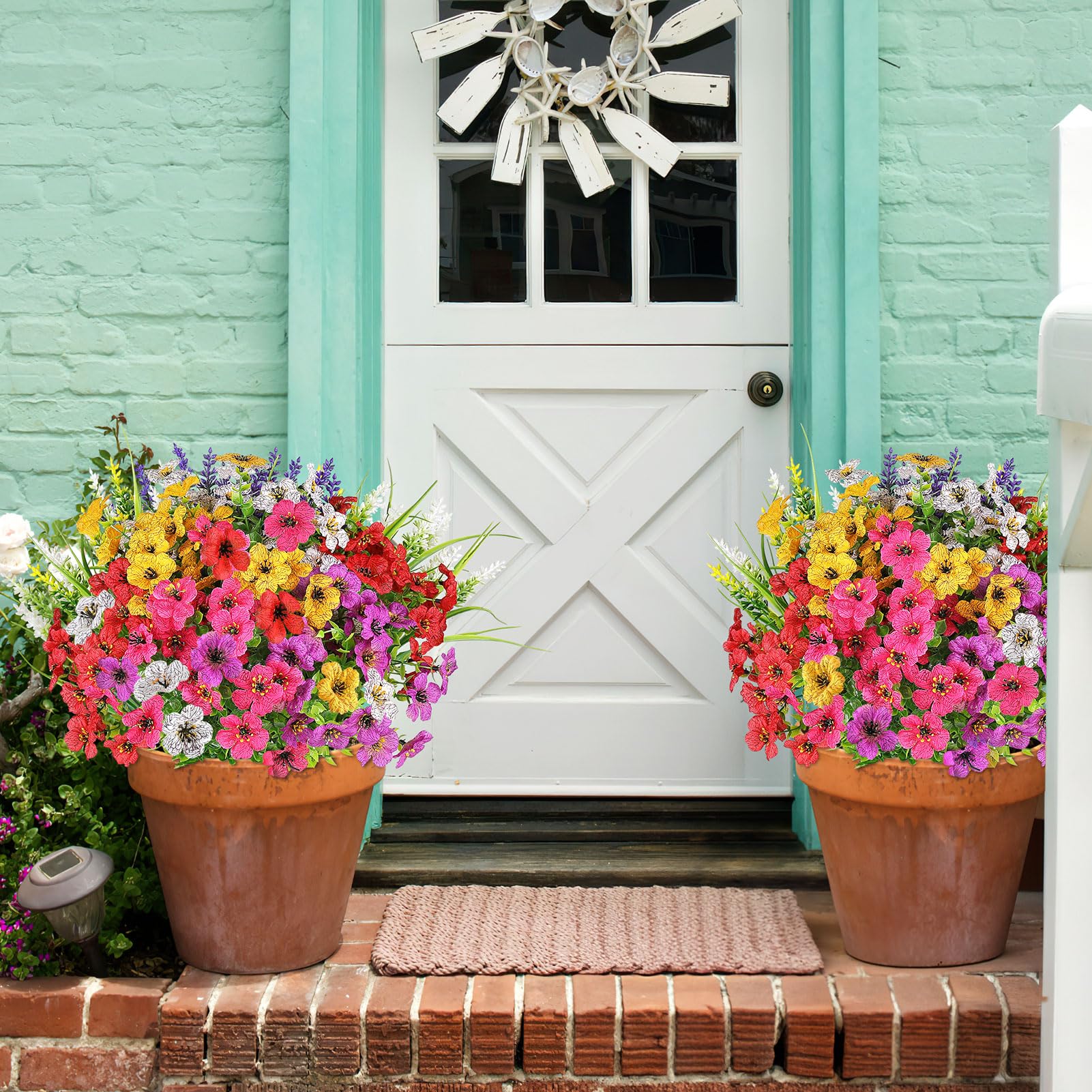 Perfect for Outdoor/Indoor - Plastic flowers are ideal for outdoor porches,walkway,terraces,window box,front yard,pots,hanging planters,gardens,landscape,windowsills,allow you have beautiful color all year around.Also suit for birthdays,weddings,Memorial place or grave,they can live anywhere,and have withstood heavy rain storms and winds