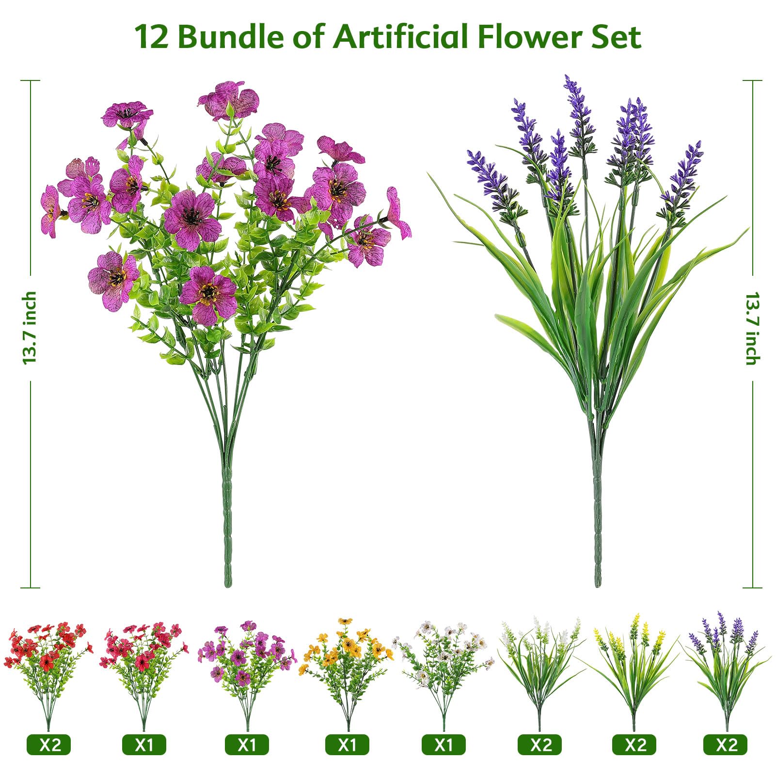 12 Bundle Super Value Set - You will get 12 Bundle artificial flowers, the mix of colored artificial flowers includes red×2,yellow×1,purple×1,white×1,fuchsia×1, and lavender monkey grass yellow×2,purple×2,white×2. Full Size and Ideal Home: approx 13” High x 9.5” Wide