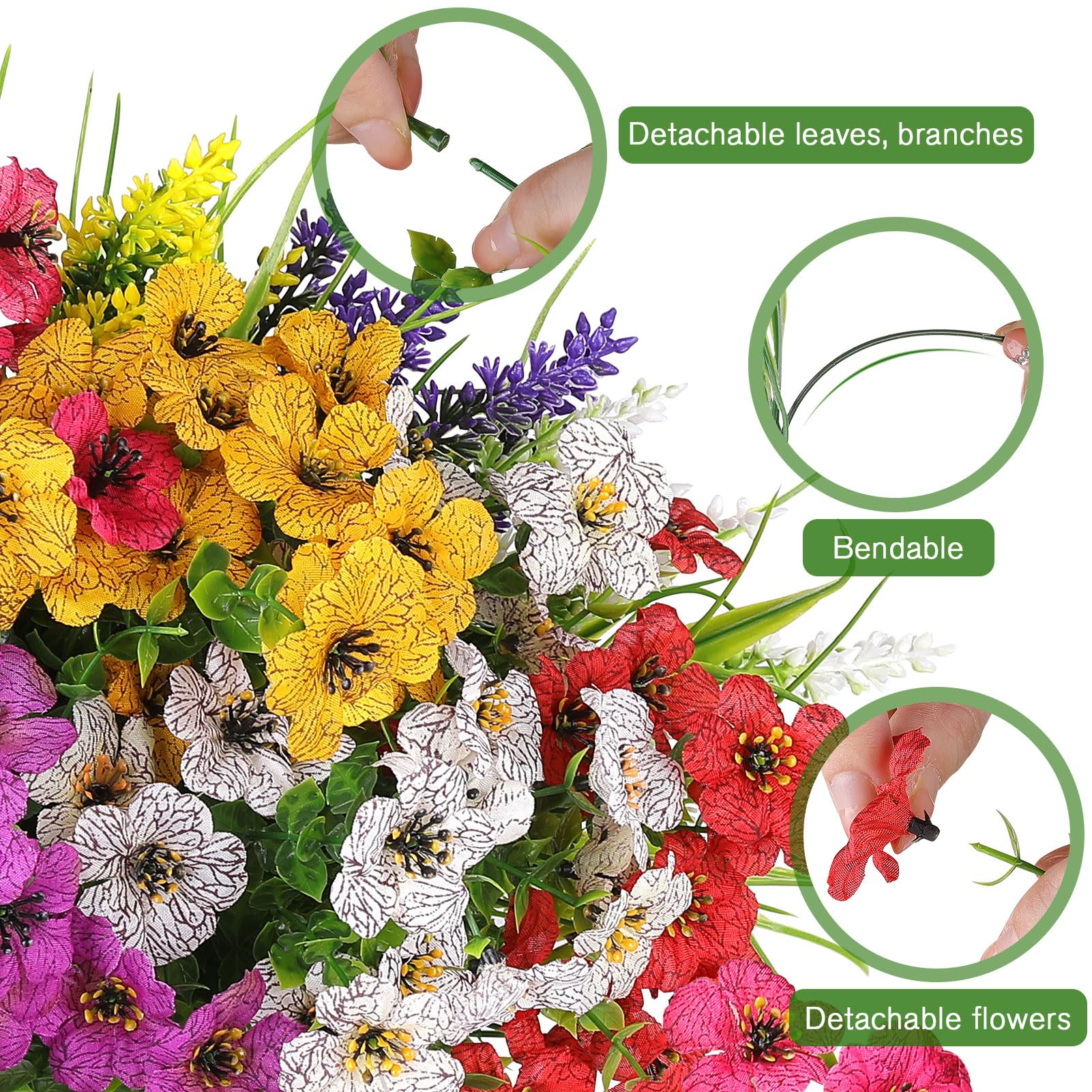 Realistic Artificial Flowers - Fake flowers are made of PE plastic(ECO-Friendly) and high-quality silk cloth,100% SAFE.Each flower come as close to real as can be, offer true-to-life petal and foliage textures.Honestly unless you stop and touch them people will think they're real,they even fooled the bees