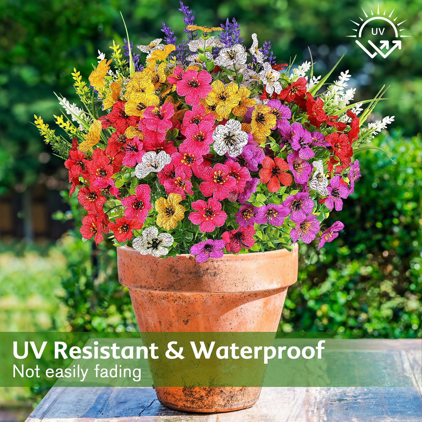 No Fade - The Fake flowers are waterproof and sunscreen, and are not easy to fade.they are holding their own in full sun and no watering needed and very flexible and realistic to the point they have a soft gentle sway on a windy day