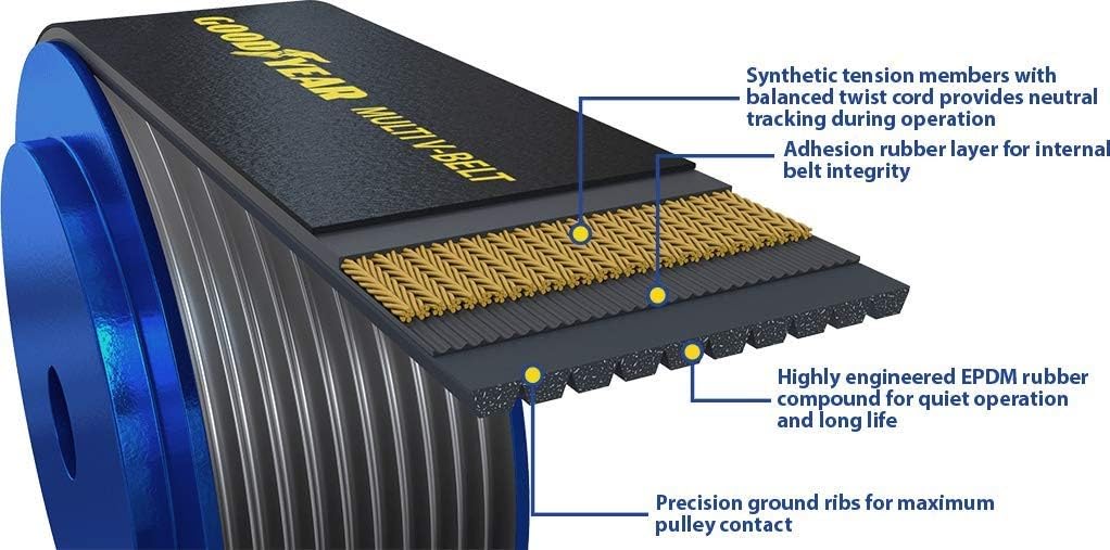 - Enhanced Performance: Goodyear Multi V Serpentine Belt with EPDM Rubber and Balanced Twist Polyester Cord offers superior power transmission, reduced noise, and vibration for a smoother driving experience