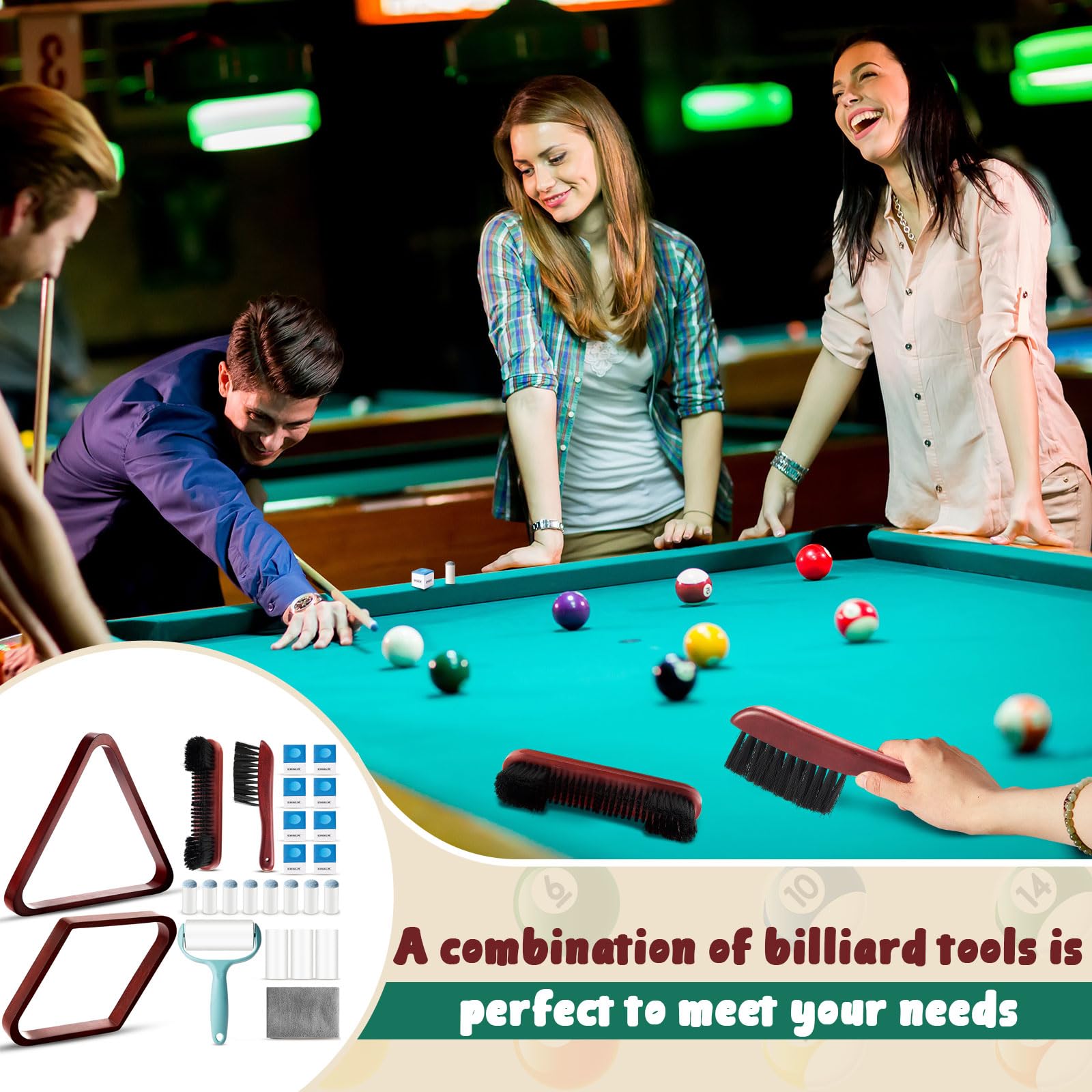 Comprehensive Billiard Accessories Package: gain from an all encompassing assortment of pool table accessories; Our package contains a triangle pool ball rack, diamond pool ball rack, 2 pool table brushes, a lint roller with three refills, billiard polishing cloth, a set of 8 billiard cube chalks, and cue tips; These accessorizing tools create an ideal billiards playing environment, suited for the home, gaming halls, billiard rooms, or anyone passionate about the game