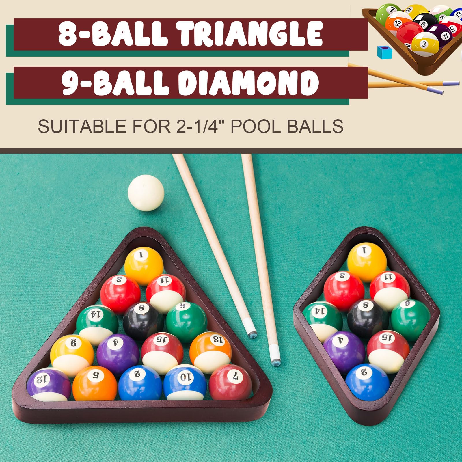 Precision Focused Game Play with Pool Racks and Chalk: satisfy your shots and increase your scoring chances with our pool triangle rack and diamond pool ball rack; These racks ensure pristine alignment of billiard balls that fit standard 2-1/4 inch in size; Complement your aiming skills with our cube chalk, which enhances the friction between the cue tip and the ball, ensuring precise and accurate shots