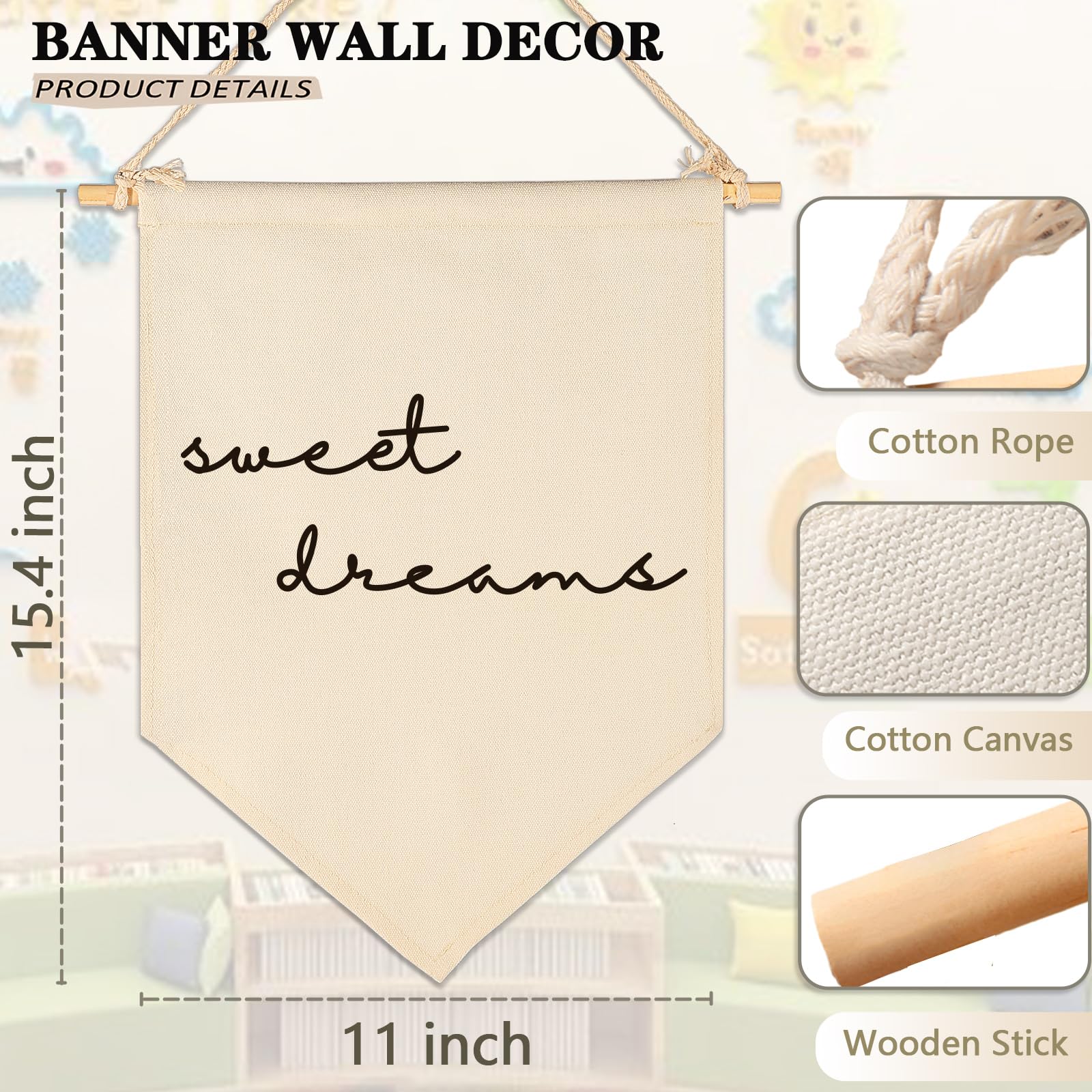 Crafted from natural cotton canvas, this 15.4 x 11 inch nursery wall banner brings a soft and calming touch to baby room, toddler space. The durable fabric keeps its shape with a natural texture, while the clear print stays bright with everyday use. Lightweight and easy to hang, it comes with a wooden dowel and pre-tied twine for quick setup on walls, doors or shelves. The versatile size fits small spaces without feeling crowded, making it perfect for creating a cozy nursery atmosphere. A thoughtful gift for baby showers, newborn arrival or first birthday.