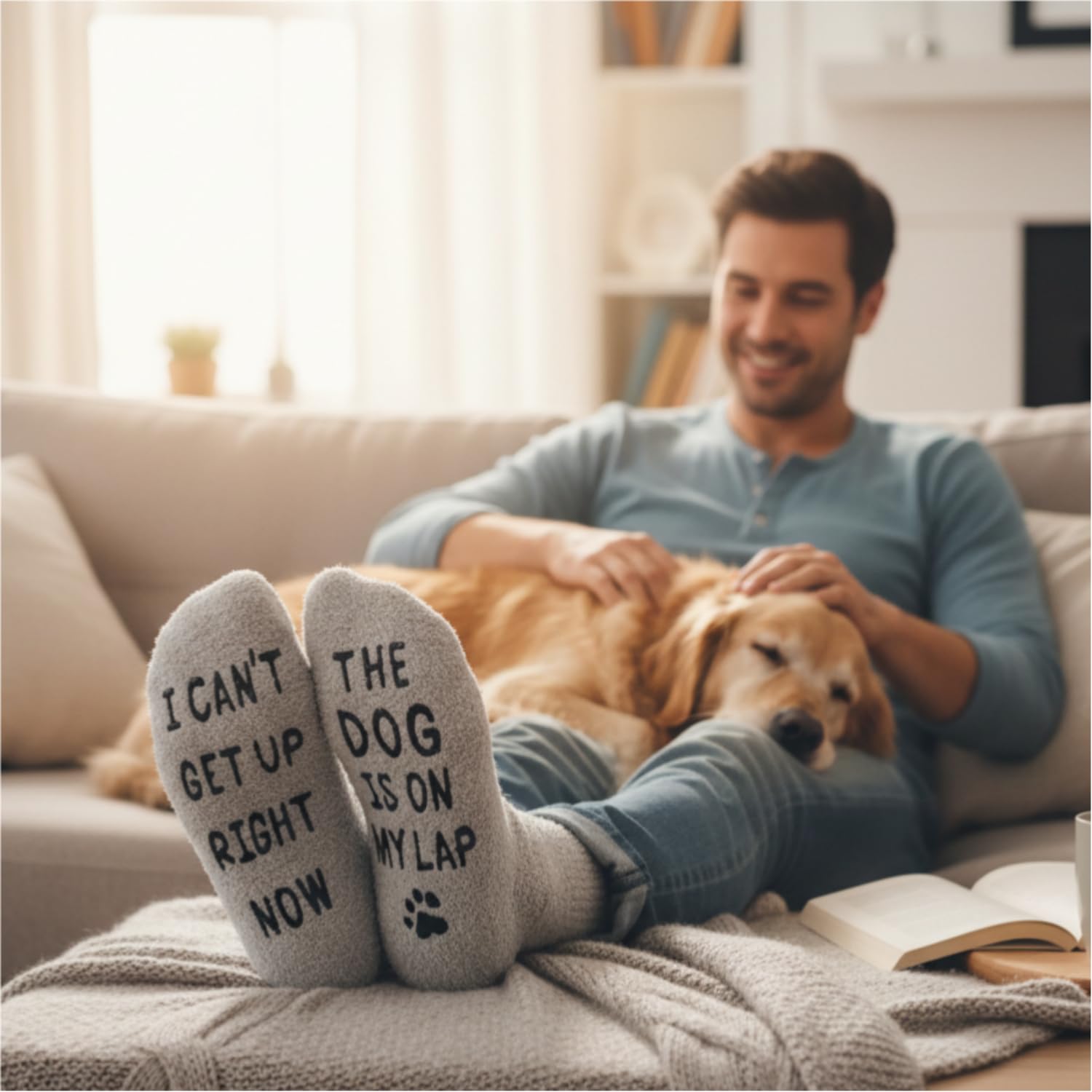 FUZZY DOG LOVER SOCKS: These grey fuzzy socks feature cute dog paws, grippers on the bottom and funny sayings "I CAN'T GET UP RIGHT NOW THE DOG IS ON MY LAP".