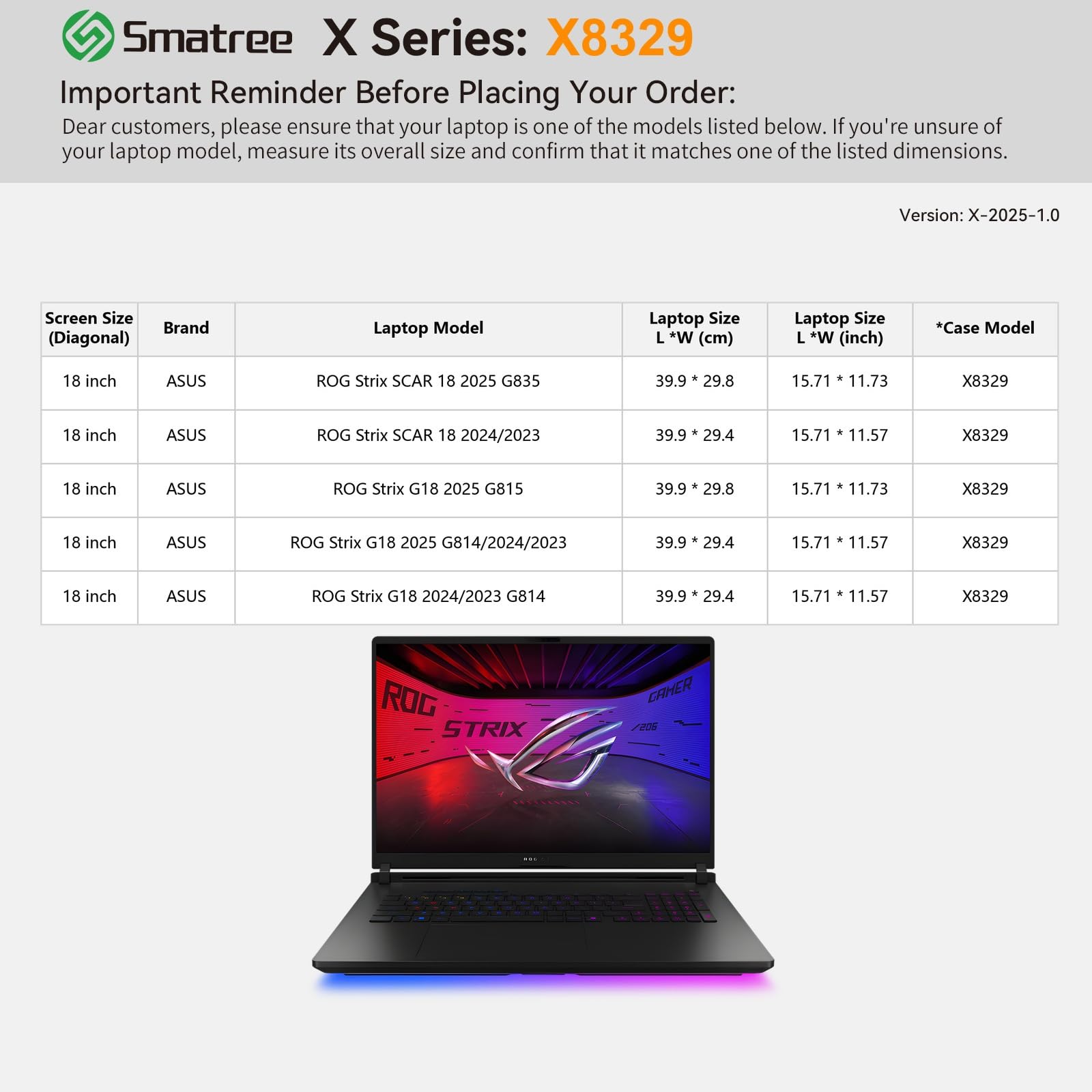 Compatibility: designed to perfectly fit for 18 inch ASUS ROG Strix SCAR 18 (2025) G835; 18 inch ASUS ROG Strix SCAR 18 (2024) G834; 18 inch ASUS ROG Strix SCAR 18 (2023) G834; 18 inch ASUS ROG Strix SCAR 18 (2023) G814; 18 inch ASUS ROG Strix G18 (2025) G815/G814; 18 inch ASUS ROG Strix G18 (2024) G814; 18 inch ASUS ROG Strix G18 (2023) G814