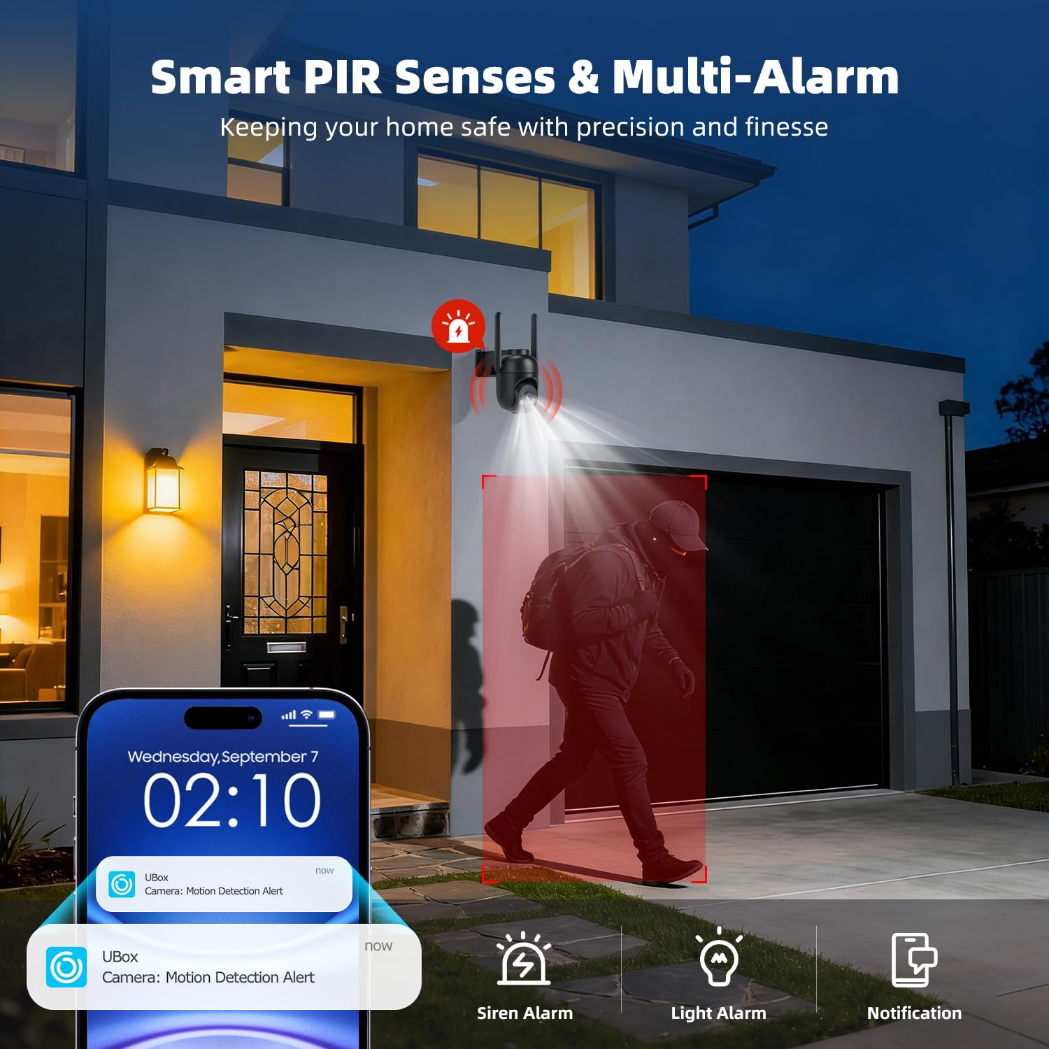 【Smart Motion Detection & Real-Time Alerts】 Security cameras wireless outdoor features an advanced PIR motion sensor that detects movement and immediately sends an alarm notification to your mobile phone when humans or animals are detected. Built-in microphone and speaker let you listen and speak through the app to deter intruders. If you turn on white light alarm & siren alarm, solar camera will also emit dazzling lights and sirens, and you can customize detection zones and sensitivity to reduce unnecessary notifications.