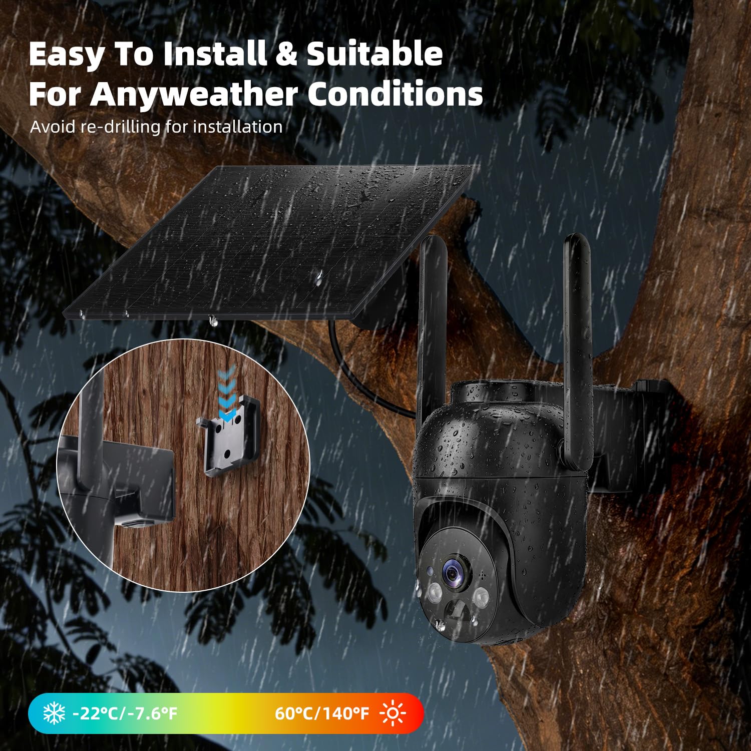 【High-capacity Battery & Non-stop Solar Powered】 No WiFi security camera that works without WiFi comes with a rechargeable battery and a 6W solar panel; the high-capacity battery and solar panel together provide continuous power for 365 days of uninterrupted operation, so you don't need to worry about it running out of power. Plus, with an IP65 weatherproof rating, this solar outdoor camera withstands rain, dust, heat, and cold, delivering reliable performance in harsh outdoor environments year-round. (Do not support WiFi)
