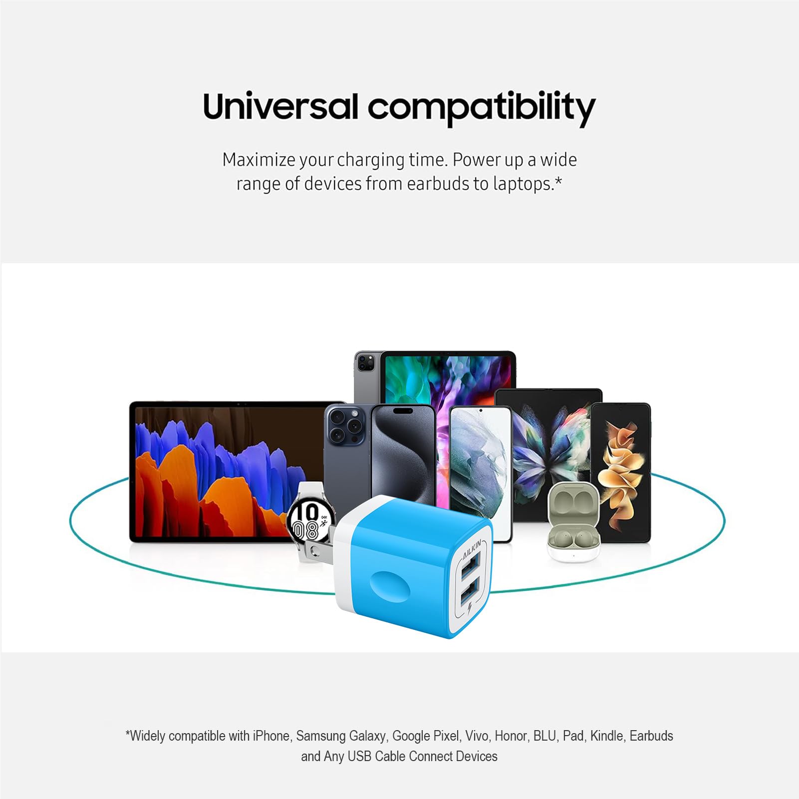 【Multipurpose】: Universal USB charger box match all USB A cable/cords or your phones. Like iPhone 17 Pro Max/17Pro/17/Air/16Pro Max/15Pro/15 Plus/15/14/13/12/11 Pro Max, Mini, SE, XR, XS MAX, XS, X, 8 Plus, iPad Pro, iPad Air, and iPad mini. Samsung Galaxy Note 20 Ultra Note10 Plus 9, Galaxy S23 S22 Ultra S21+ S24 S25 5G S10E S9 S9 Plus S8+, A04S A03S A02S A14 A12 A13 A51 A52 A53 A12 A17 A13, Google Pixel 10 9 8 Pro 7a 7 6 Pro 6a5 5a 4xl 4 4a, HTC, Blu, LG, Moto, Kindle Fire HD 10 9 8, etc.