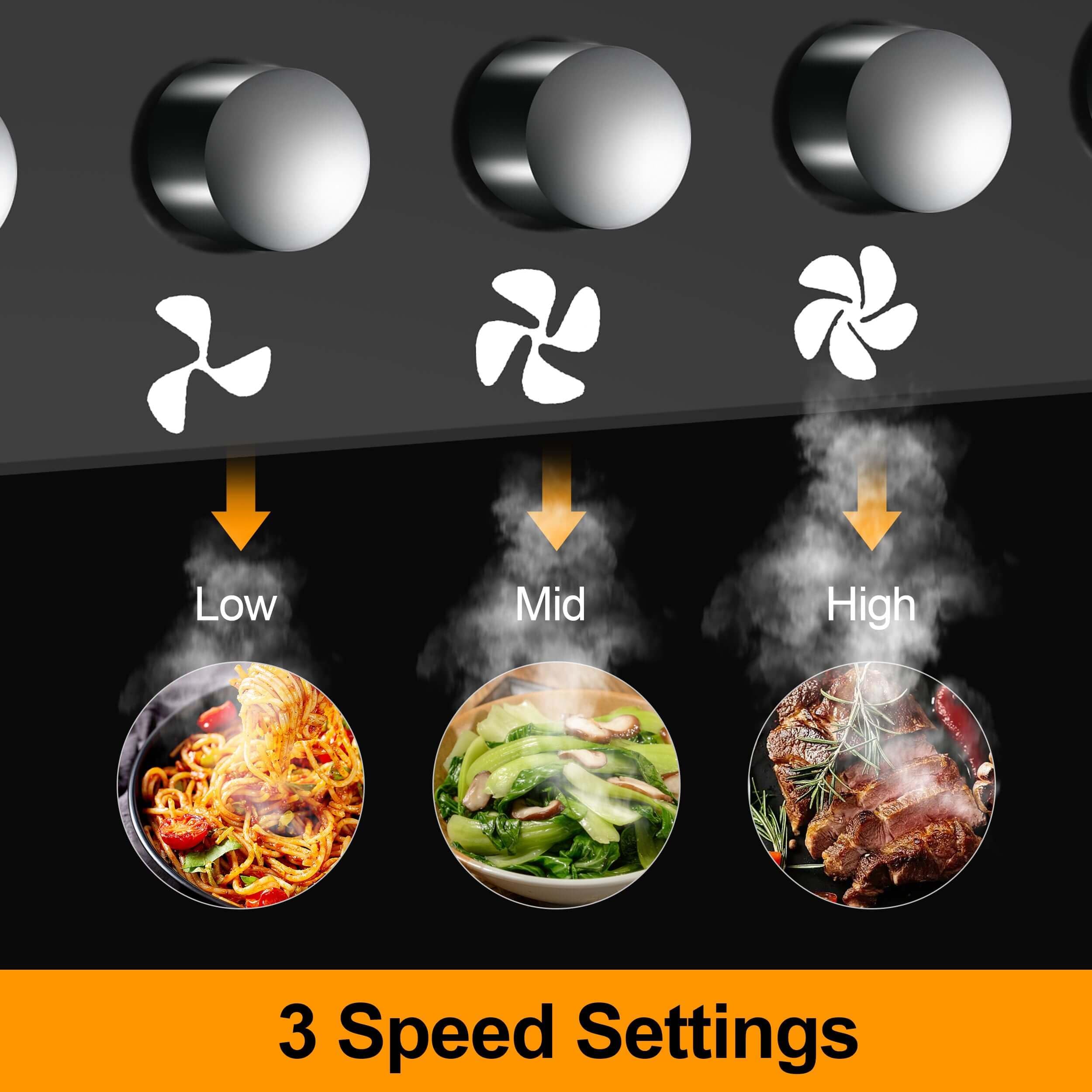 【Vent Hood with Easy 5-button controls】Easy to turn on and off,Low/ Mid/ High Speed,Light on and off, allows you to easily control the range hood during cooking. Noise of Kitchen Vent Fan less than 55dB at the highest speed.The LED lamp provides the hood with bright lighting for better visibility at night.