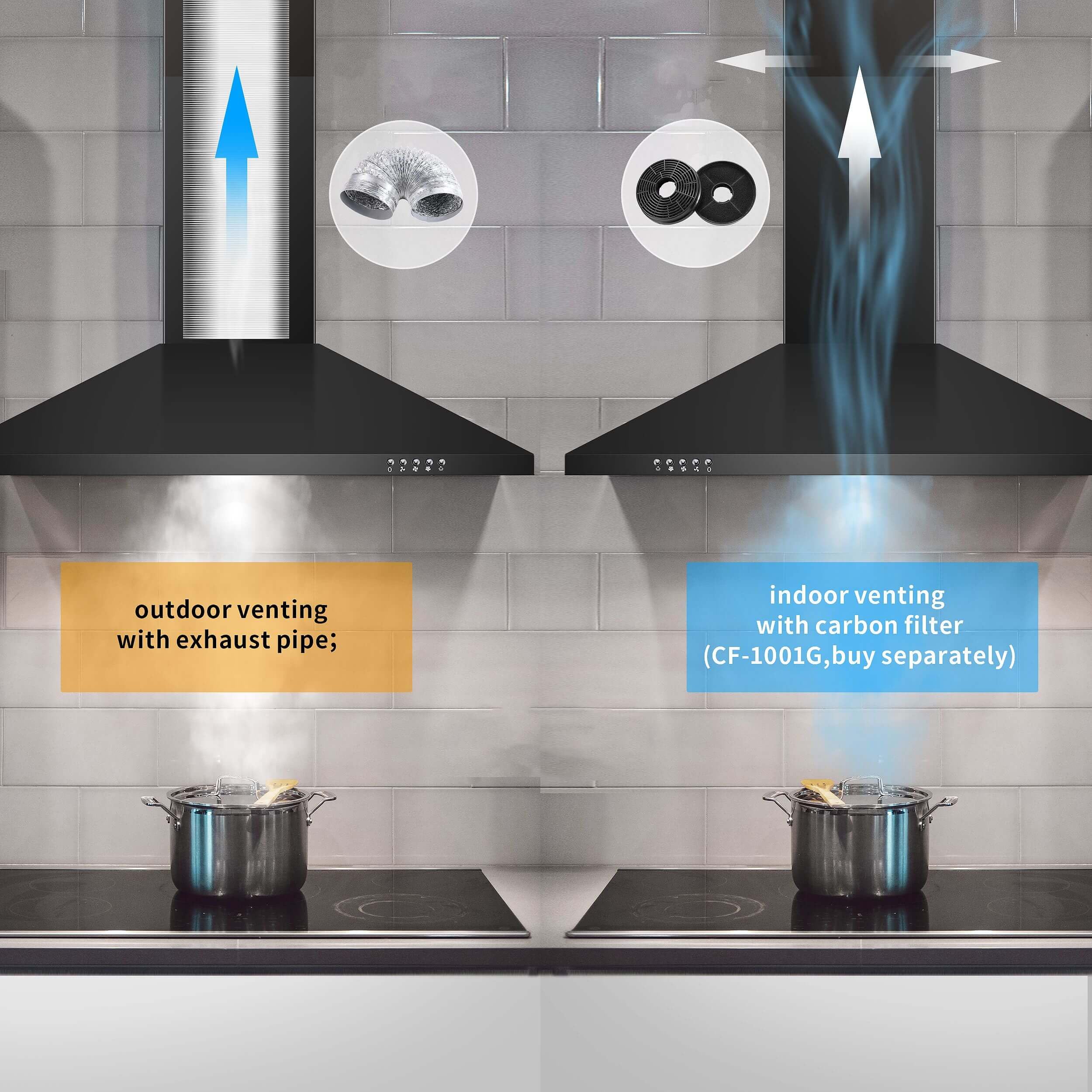 【Efficient Airflow Kitchen Hood】Max 450 CFM suction removes smells and odors with ease for a clean kitchen.This kitchen hood has two modes venting option,it has a 6 inch round top vent and comes with a 6.5ft aluminum exhaust pipe,can be vented outside. Optional carbon filter kit to convert your range hood to ductless(Sold Separately, Purchase Part # CF-1001G).