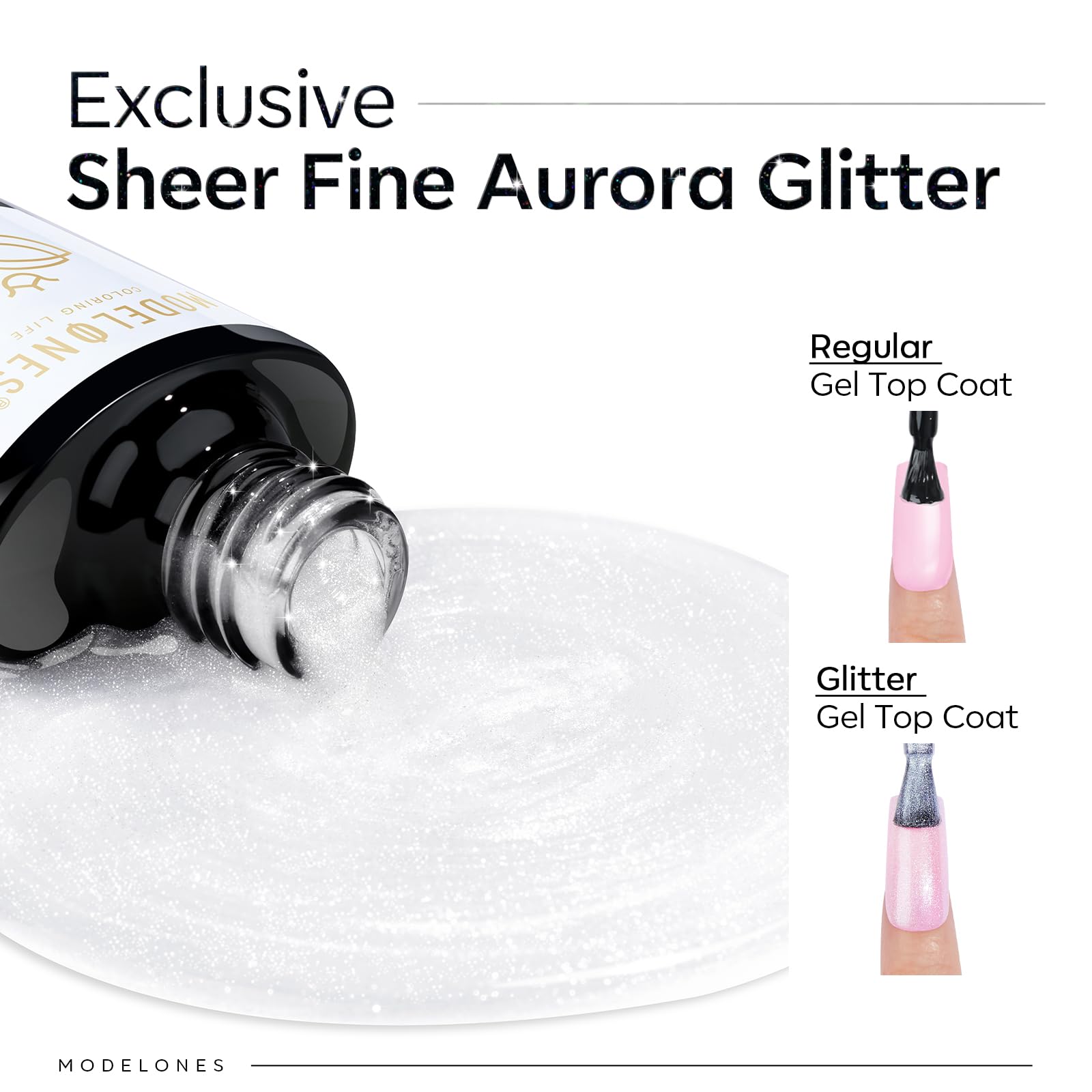 Upgrade Glitter Finish: Modelones 2024 New Glitter Top Coat Gel with Sheer Aurora Micro Glitter ; In the static, is a little white pearlescent exquisite glitter color , in the dynamic and from different angles it shows aurora dust iridescent dreamy effect colors (Check out our video).