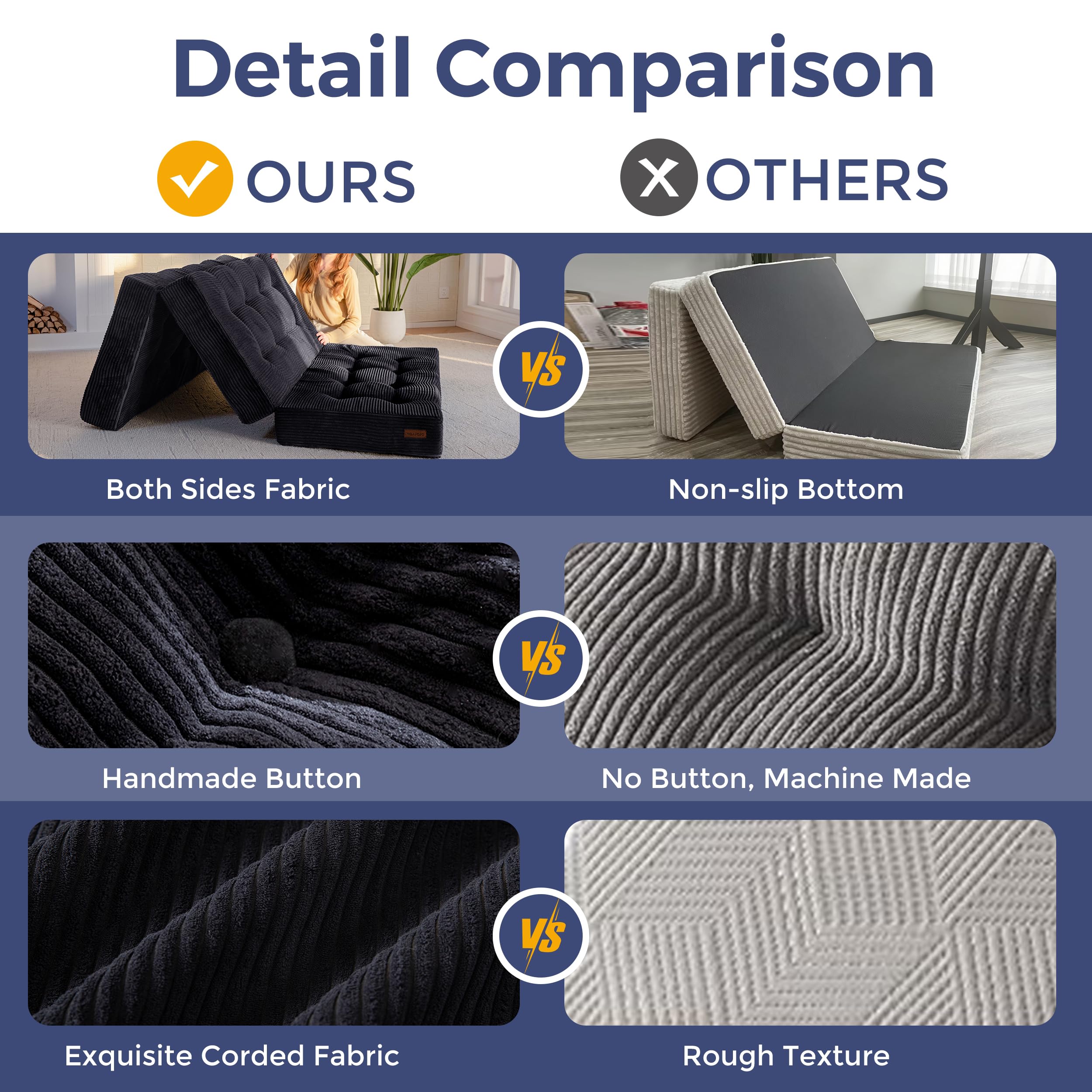 Tufted Craft Design: The topper of the foldable triple-fold mattress, made of ultra-soft and breathable corduroy fabric on the top, can keep you feeling fresh. The tufted crafting design adds a personalized style to the foldable mattress and also brings fun to your life