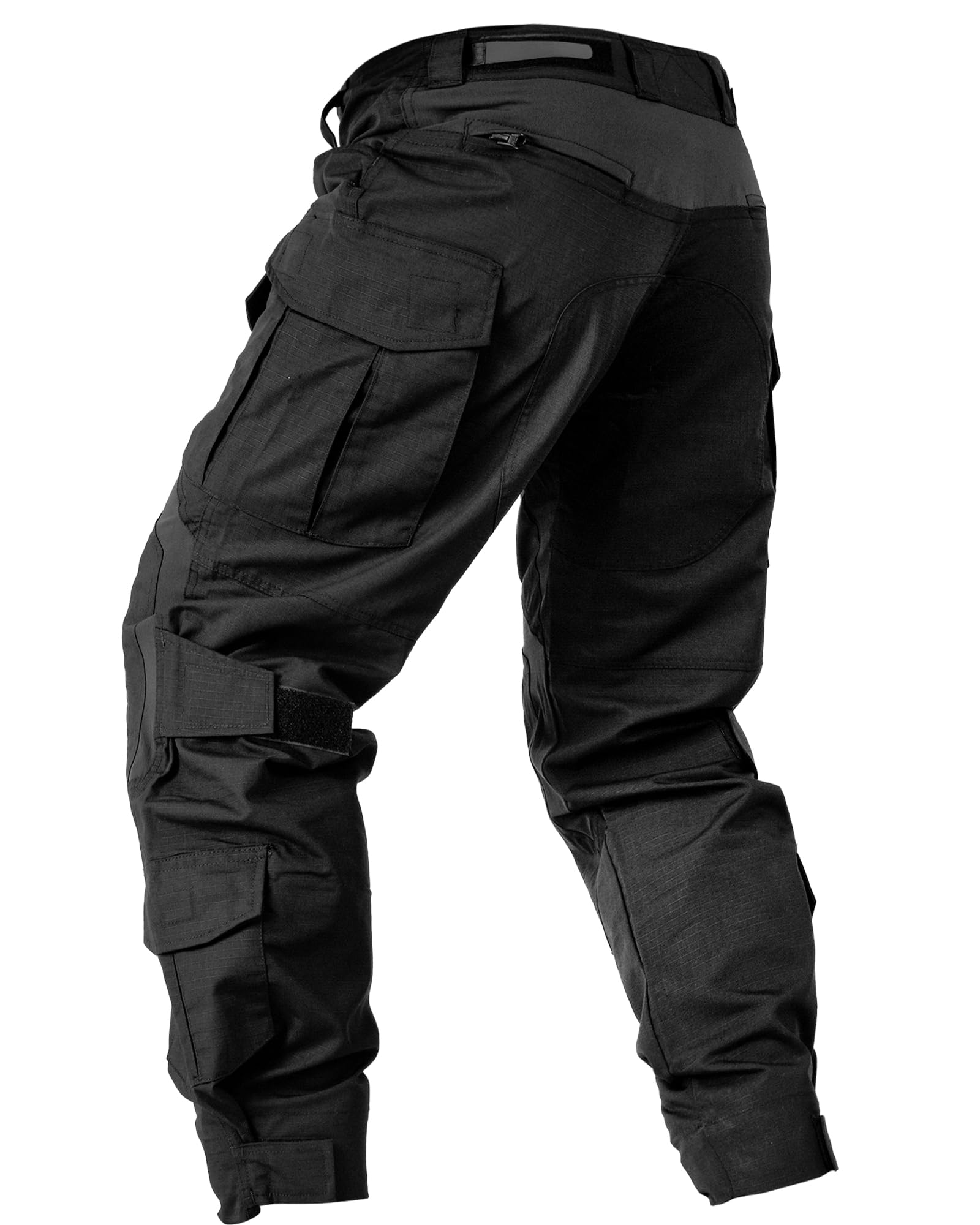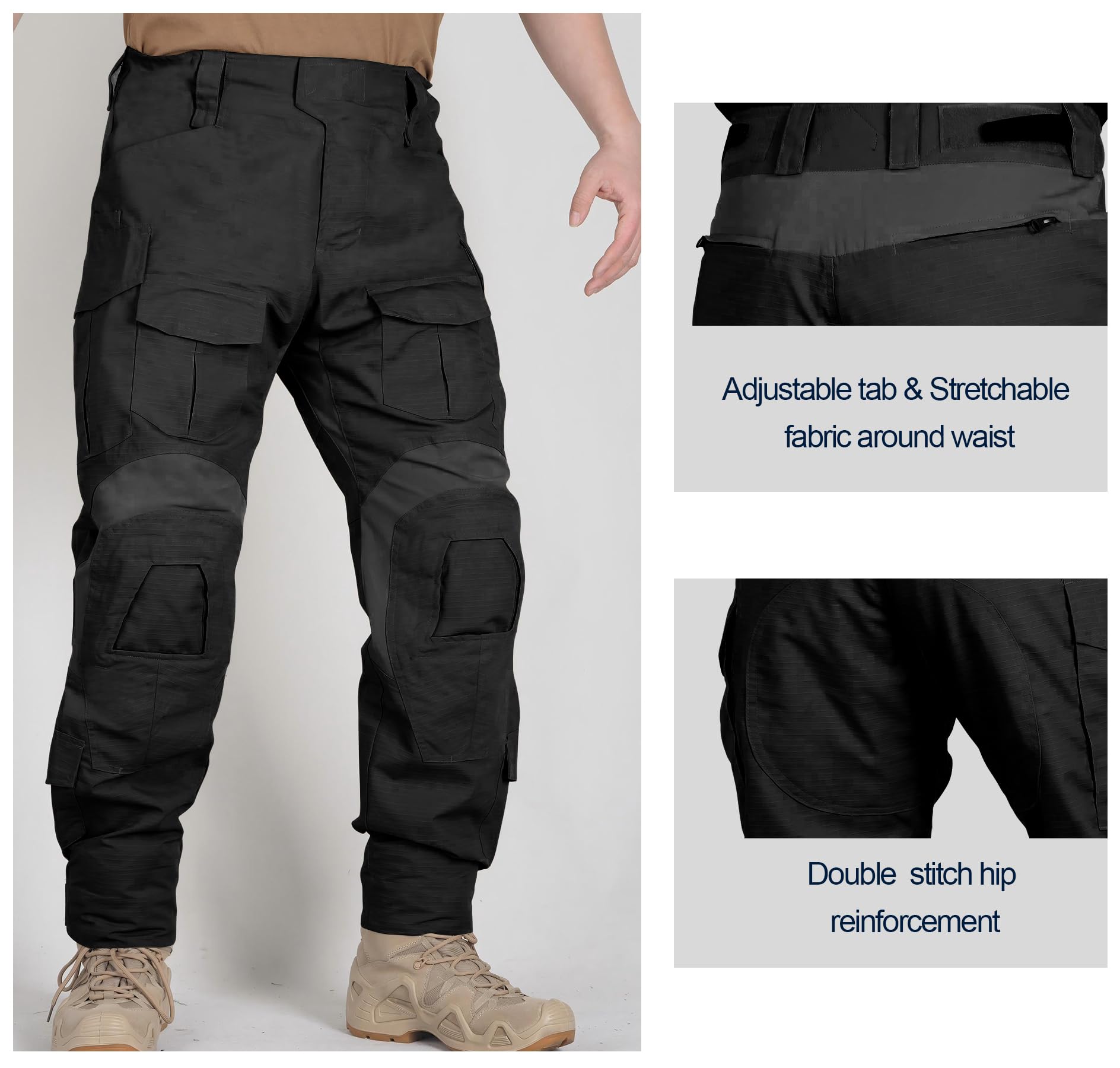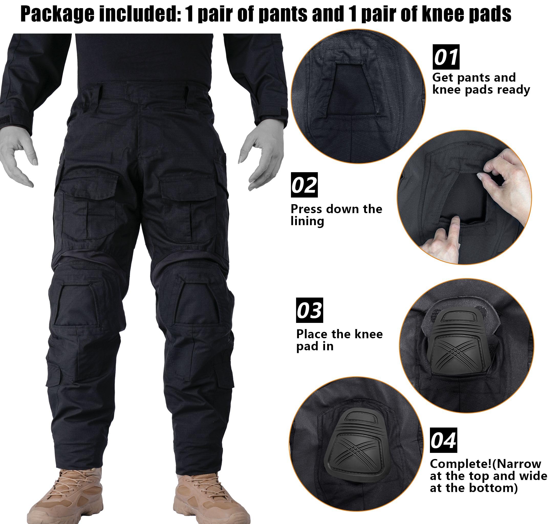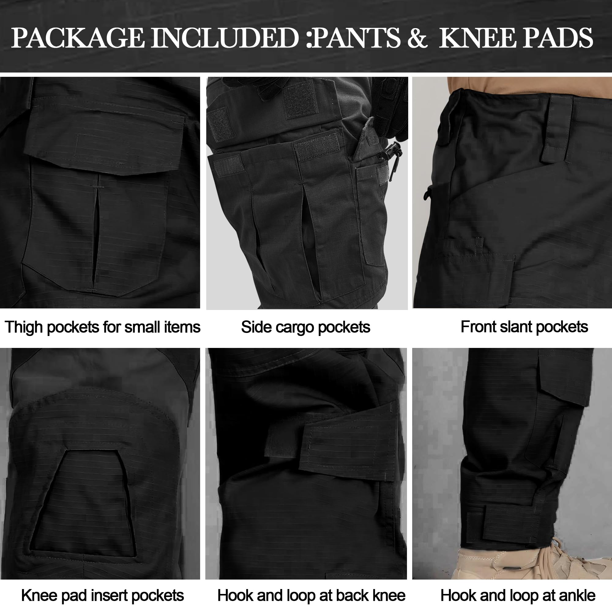 Material of tactical pants for men stretch: Tactical cargo pants are made of 65% Polyester, 35% Cotton, Woven: 95% Nylon, 5% Spandex, with splash-proof coating, water resistant and liquid repellent. It has the stretchy camouflage fabric around knee ,back of waist and crotch that allows air to flow a bit more freely and is good for moving nimbly. The height of the knee pads can be adjusted by a tension cord at the front pocket