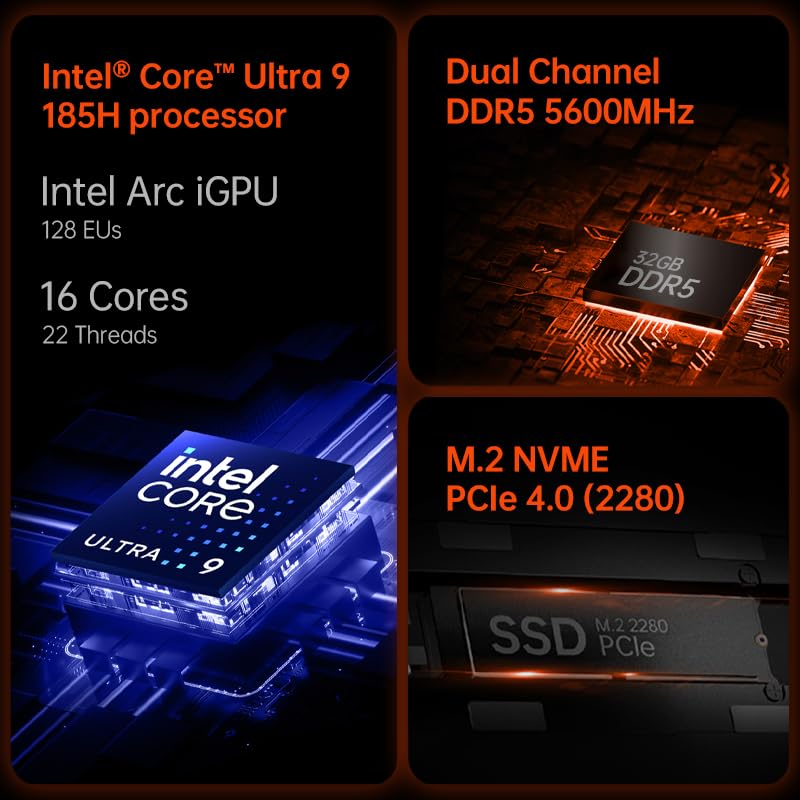 Equipped with dual-channel 32GB DDR5 5600MHz RAM and 1TB PCIe 4.0 (M.2 2280) Nvme SSD, you can easily swap the SSD, just remove the magnet cover, no need to take apart the device.