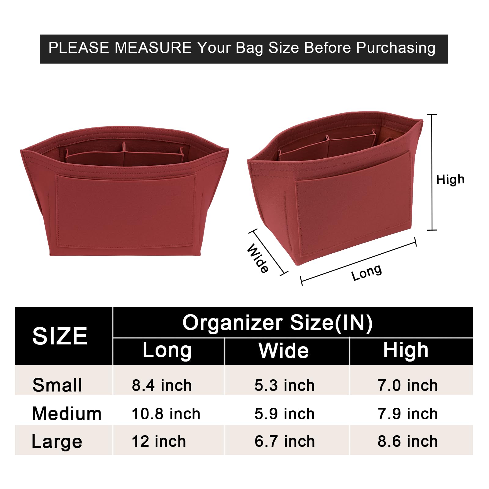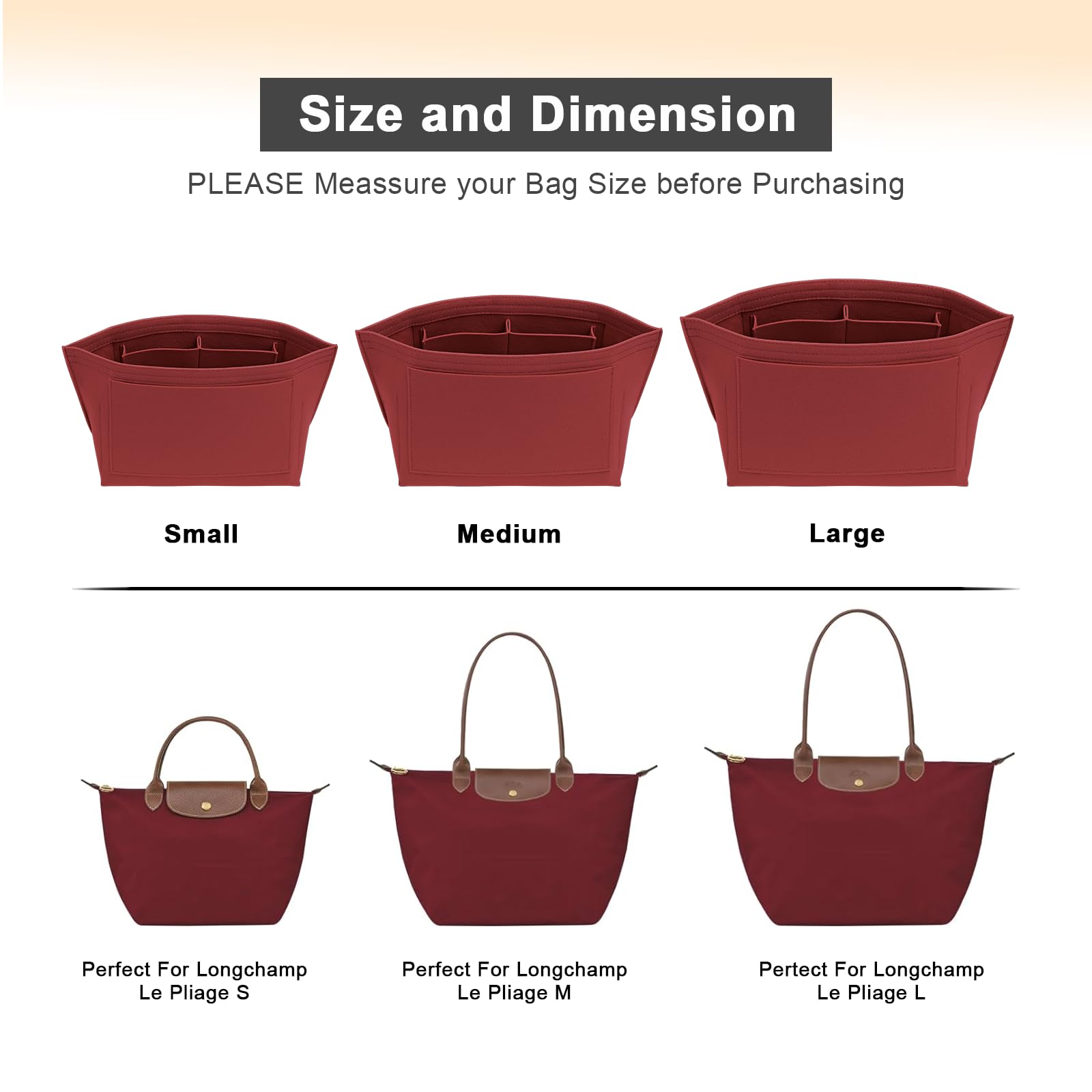 SIZE OF THE FELT PURSE ORGANINZER INSERT - Small: 8.4" (L)*5.3" (W)*7.0" (H) , suitable for Large Size of long handle of Le pliage handbag, or similar size Tote Handbag,It will be more suitable if it is LESS than 0.5-1 inches to ensure a perfect fit,Please comfirm your bag size before purchasing again, thanks.