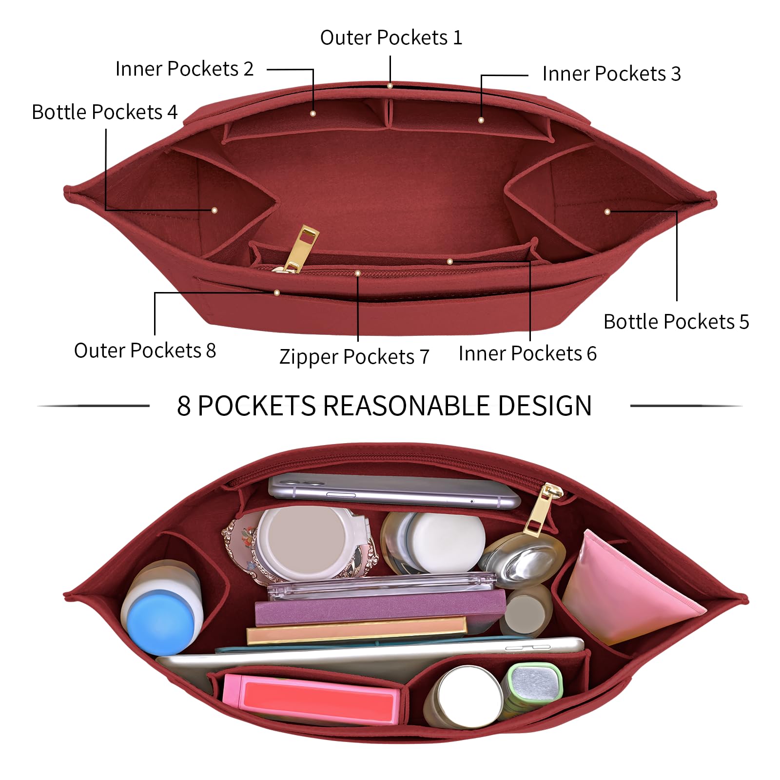 NEW design: There are 8 compartments, two of which are external pockets for large items, and the remaining 5 pockets, two double side pockets (for mugs and various small items, solving the problem of insufficient pockets) and one zipper pocket (with high-quality metal zipper head for durability), allow you to store your cell phone, wallet, cosmetics, glasses, and other personal belongings in the wallet organizer, making it easy to change bags throughout the day without rearranging. and no need to reorganize.