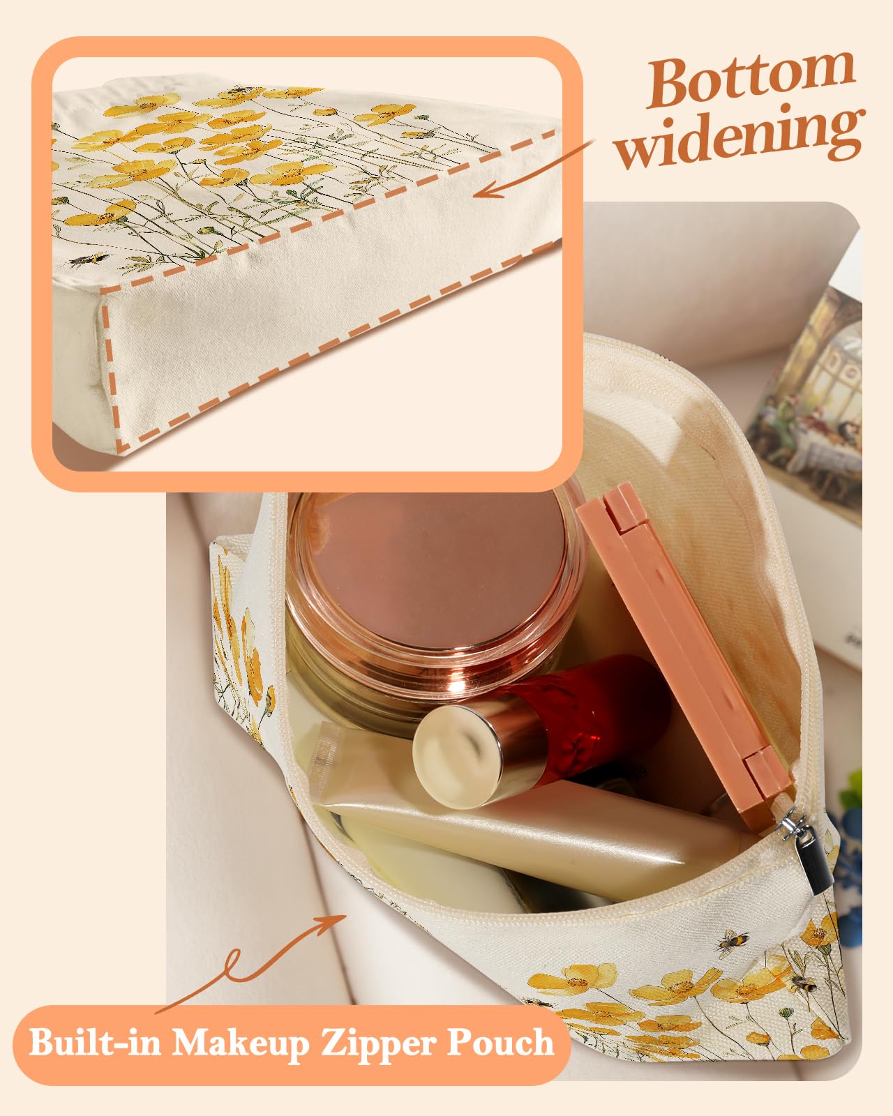 Two Canvas Bags Set: The combination of a large tote bag measuring at 14*15 inch(the handles 11 inch) and a cosmetic makeup zipper pouch bag(6*8.5inch) make it easier to organize daily personal effects. The zipper design of the small organizer bag won't let lipstick, blush, keys, earphones, paper towels and other small items fall out.