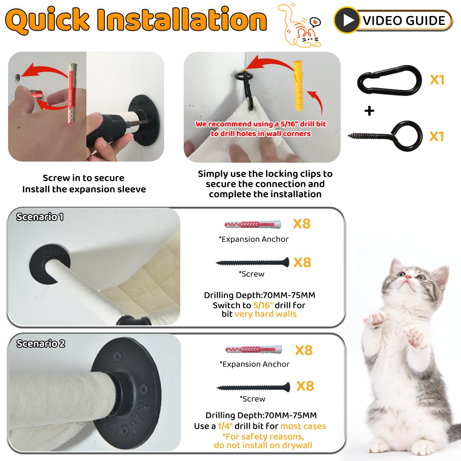 Quick Installation: Only 8 screws and circular hooks are needed to securely fix the wall mounted cat rack. Gypsum board walls are weakly load-bearing and should be installed in solid brick or concrete walls capable of 45 pounds of downforce